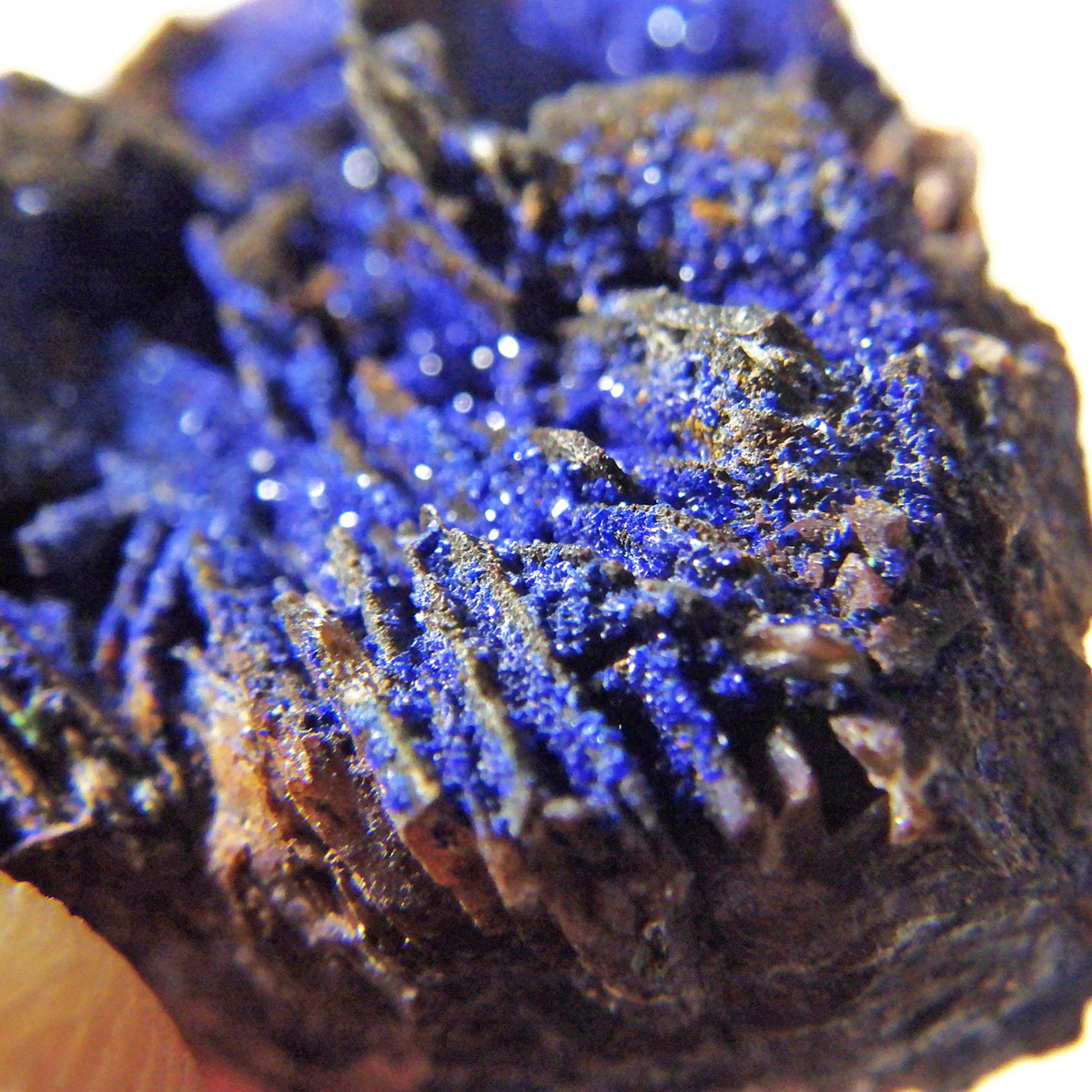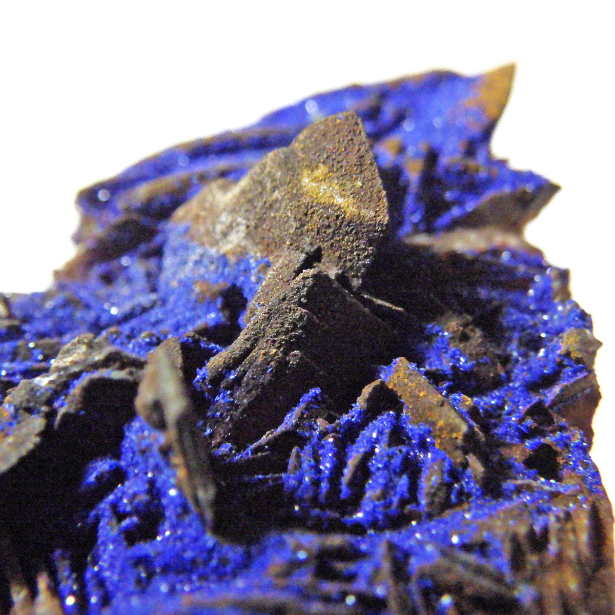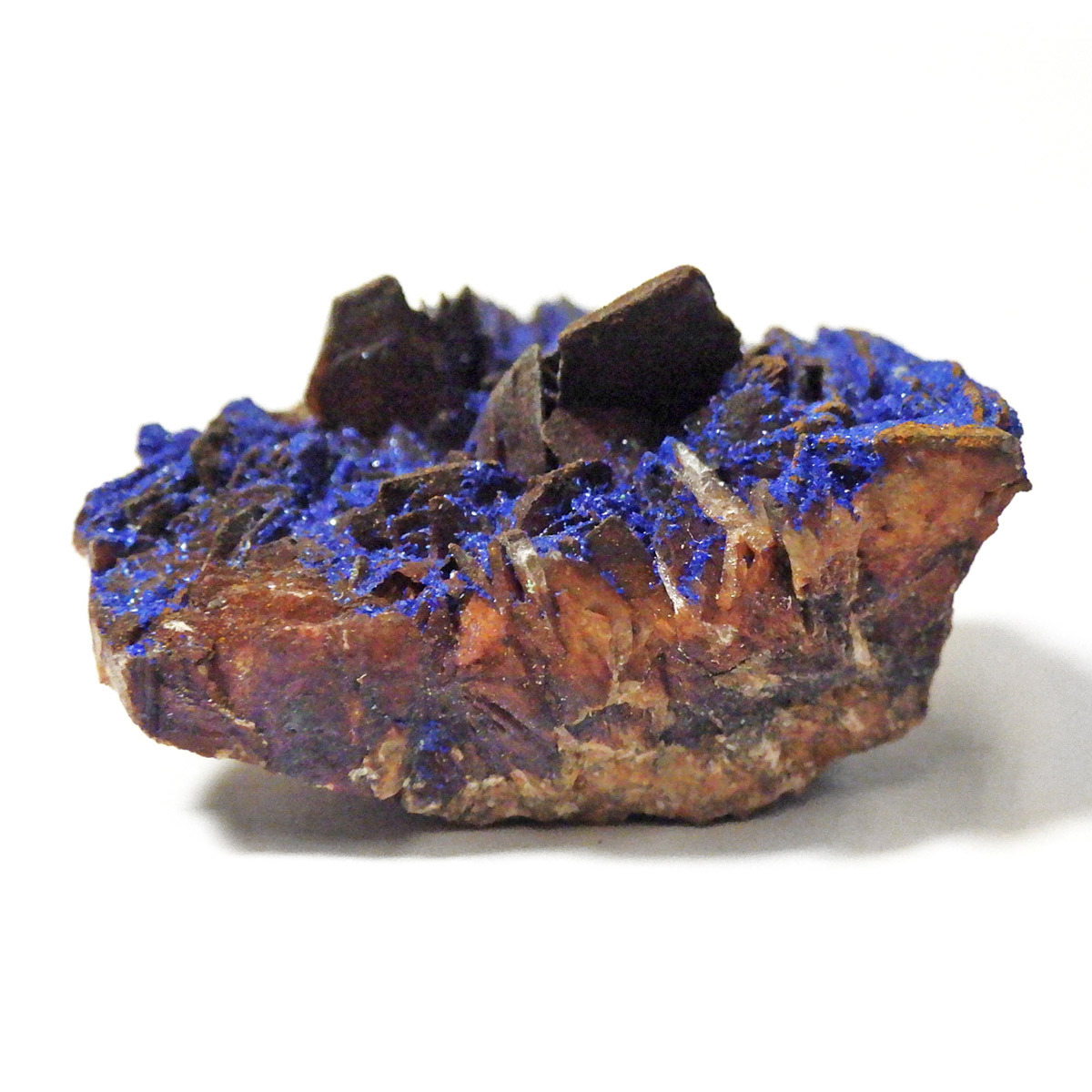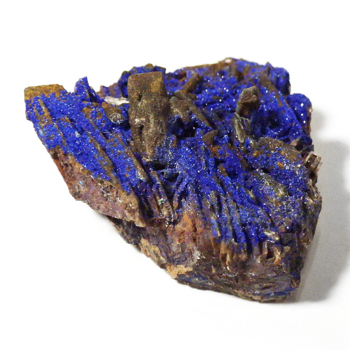 モロッコ産のアズライト結晶原石です。アズライトは産出量が少なく、鉱物コレクターの間でも非常に人気の高い希少石。中でもモロッコ産は、深く濃いブルーと美しい結晶構造を持つことで知られ、その美しさは世界トップクラスと評されています。バライト上にアズライトが結晶化されており、一部、鮮やかなグリーンのマラカイトとの共生も見られます。見る角度によってキラキラと表情を変える群青色の輝きは、まさに自然が生み出した芸術品です。