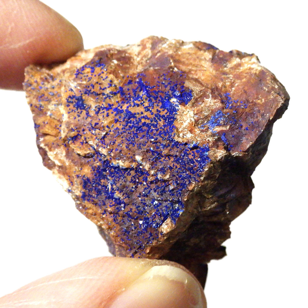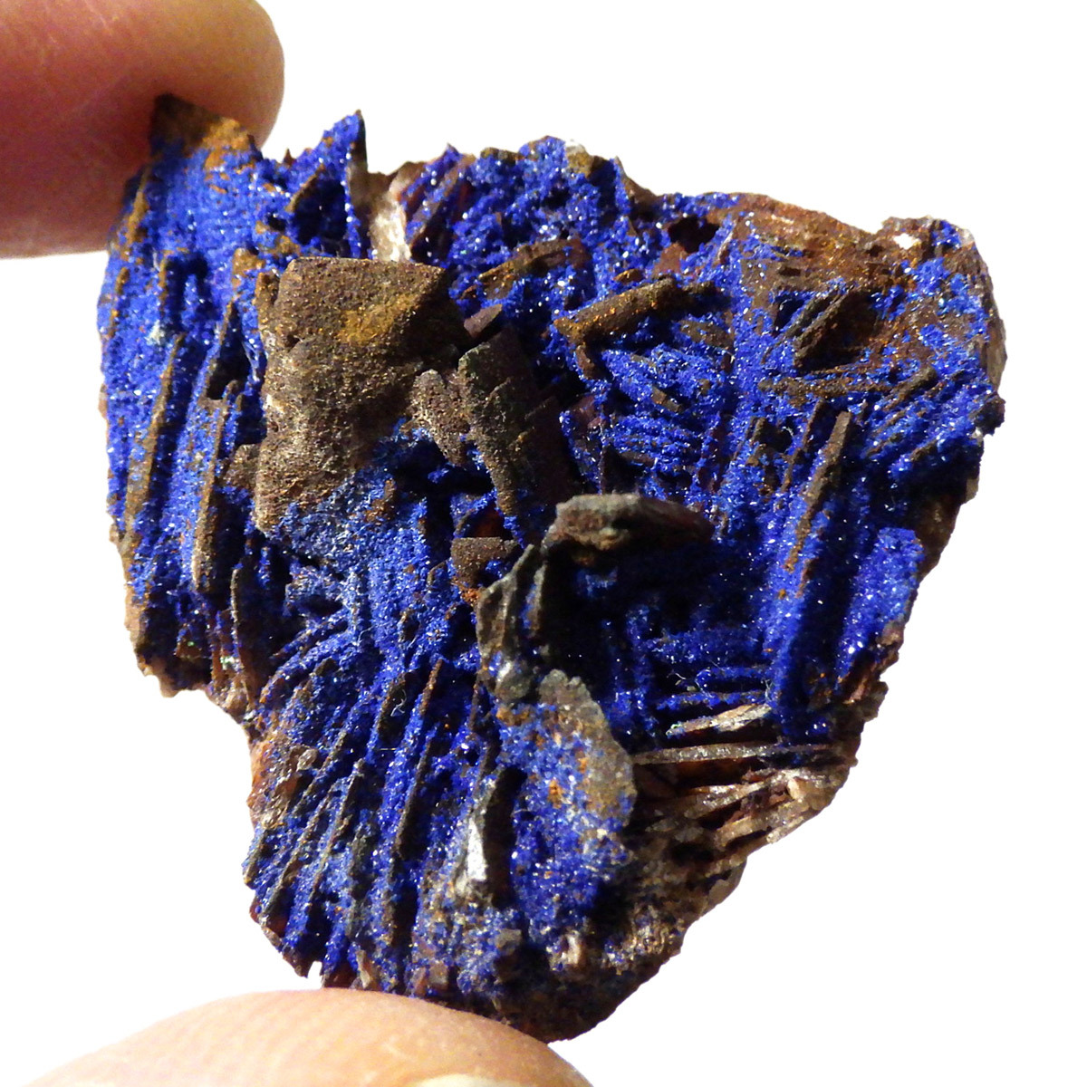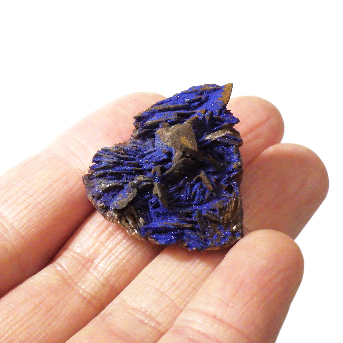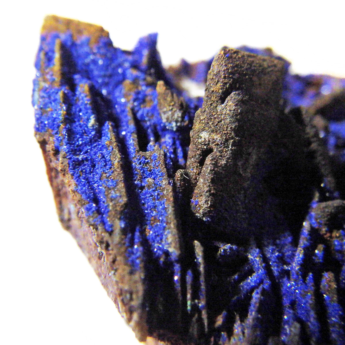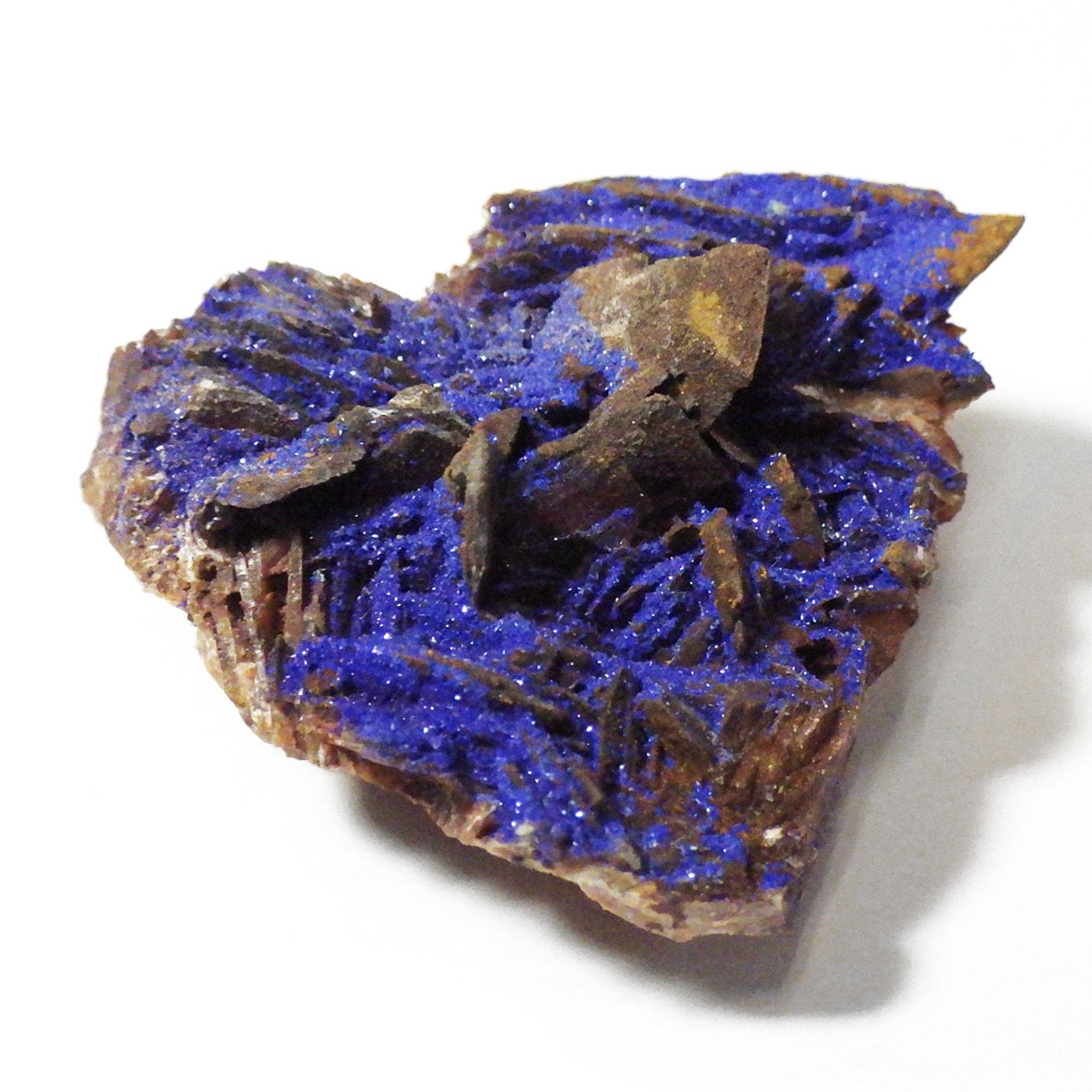 モロッコ産のアズライト結晶原石です。アズライトは産出量が少なく、鉱物コレクターの間でも非常に人気の高い希少石。中でもモロッコ産は、深く濃いブルーと美しい結晶構造を持つことで知られ、その美しさは世界トップクラスと評されています。バライト上にアズライトが結晶化されており、一部、鮮やかなグリーンのマラカイトとの共生も見られます。見る角度によってキラキラと表情を変える群青色の輝きは、まさに自然が生み出した芸術品です。
