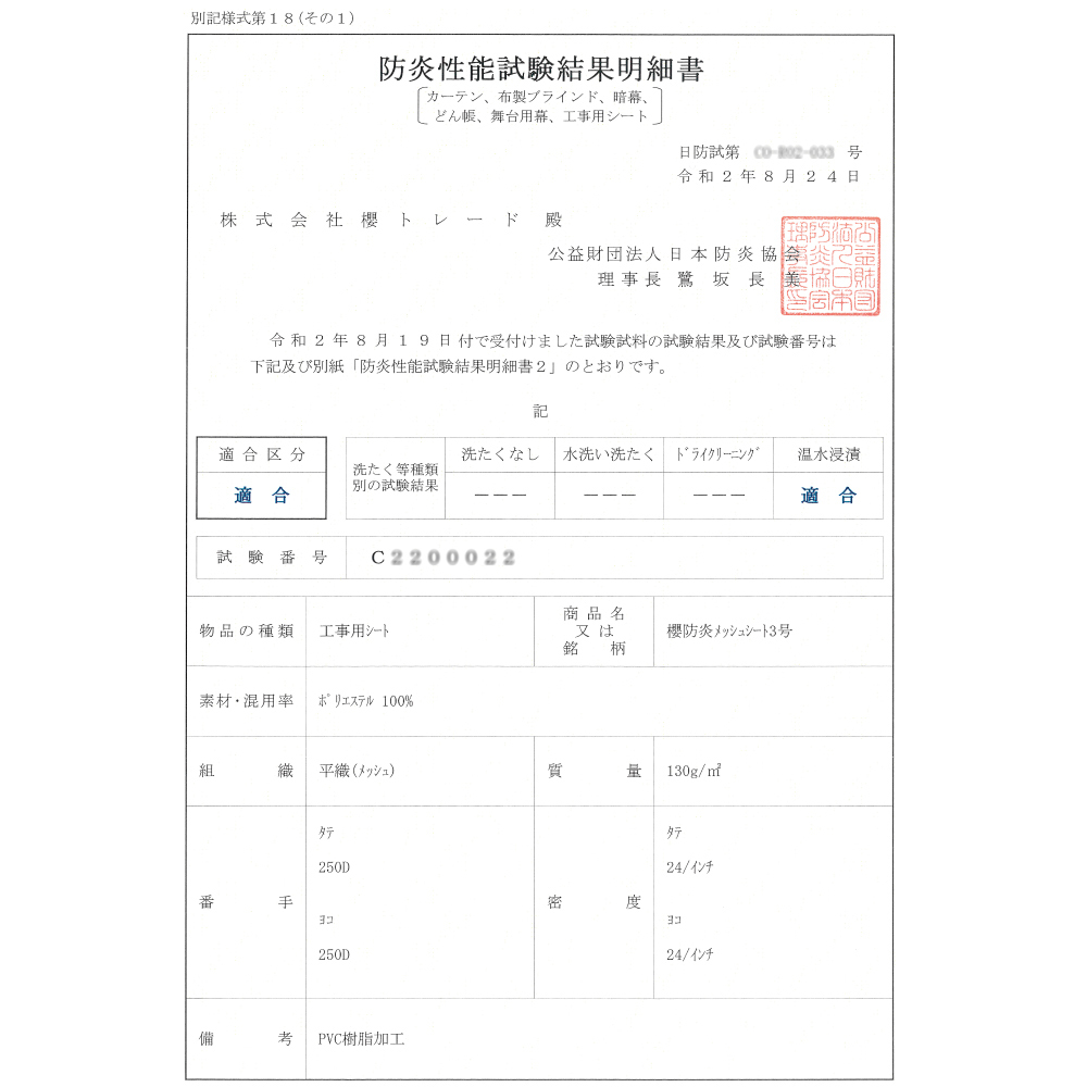 ◇消防庁認定の防炎物品防炎テストJISの強度試験方法に合格した認定商品です