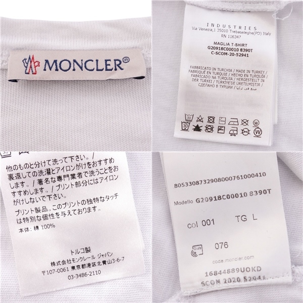 | 美品 モンクレール MONCLER Tシャツ 2020 カットソー ショートスリーブ 半袖 コットン トップス メンズ L ホワイト |