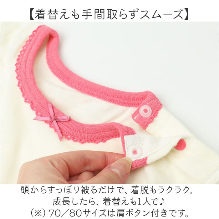 | 商品説明 | ・・【お家の中でも可愛くいたいキッズに】 ・サラッと着られるワンピースタイプ。可愛らしい「ルームウェア」♪ ・【夏に大活躍のルームウェア】 ・軽やかな着心地&涼しげなスタイル☆汗ばむ季節も快適に過ごせるアイテム。 ・【着替えも手間取らずスムーズ】 ・頭からすっぽり被るだけで、着脱もラクラク。成長したら、着替えも1人で♪ ・(※)70/80サイズは肩ボタン付きです。 ・【デリケートな肌に触れても安心】 ・柔らかく優しいコットン素材。チクチク感がなく、汗をかいてもムレにくい◎ ・【元気なお子さまにぴったり】 ・程よい伸縮性もあり、お子さまの動きを妨げないのもポイント。 ・【シーンに合わせてスタイルチェンジ】 ・裾の中央にはスナップボタン付き。ボタンを留めれば、めくれ上がりをガード。 ・【揃えたくなるラインナップ】 ・シンプルなデザインや、柄デザインをラインナップ。洗い替え用にデザイン違い揃えも☆ |