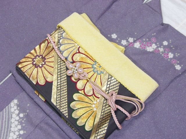 袋帯は正絹のお品で濃い紫色系時に花柄のお品です。
