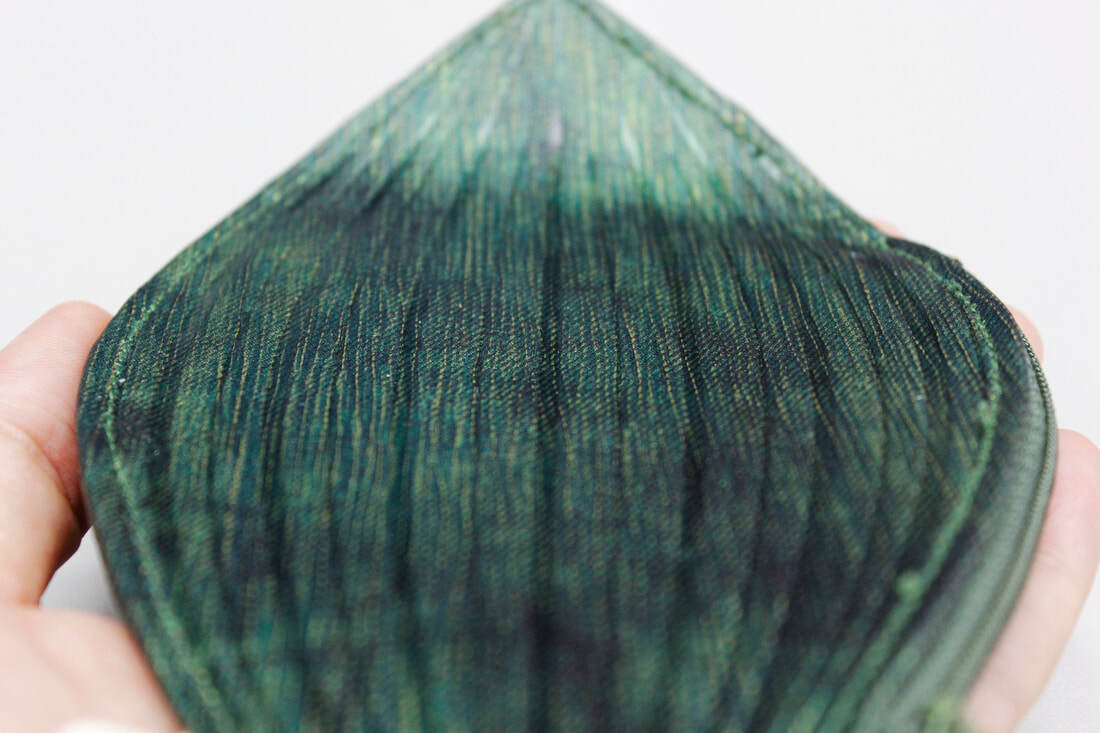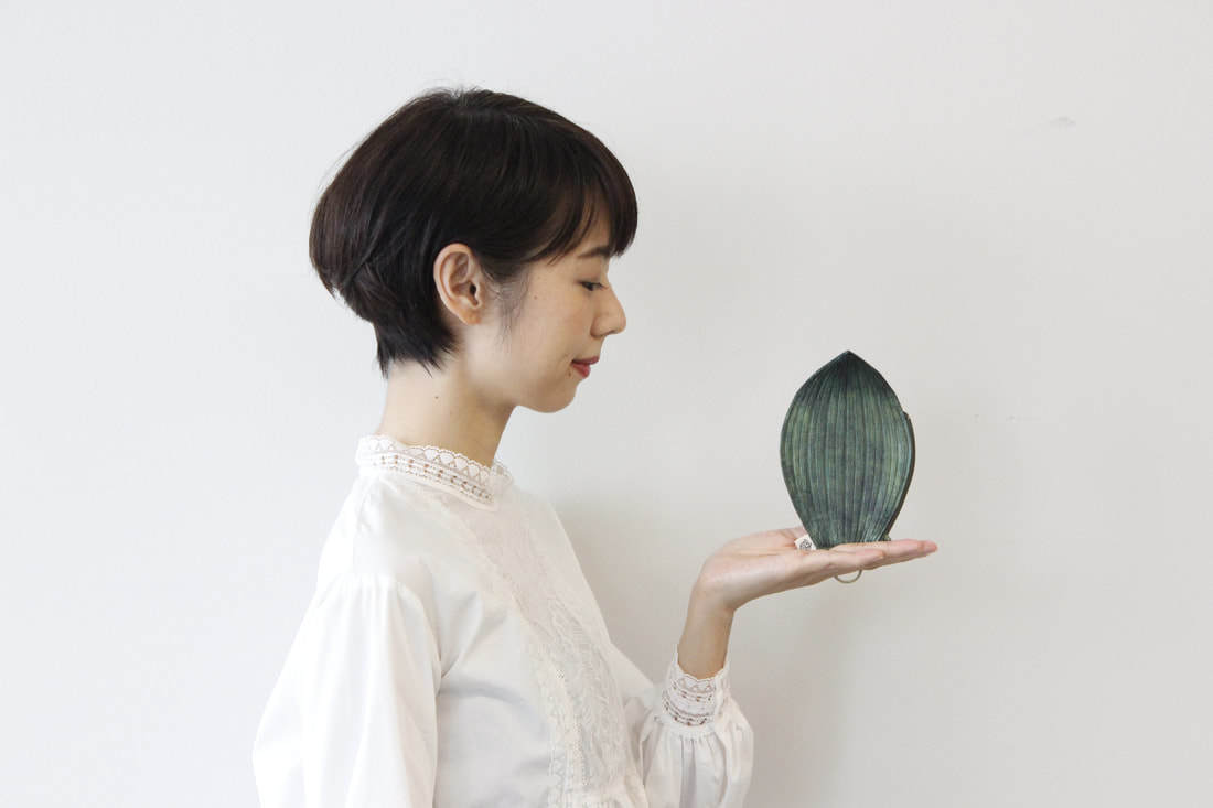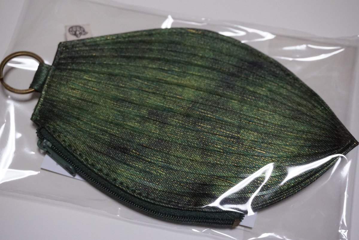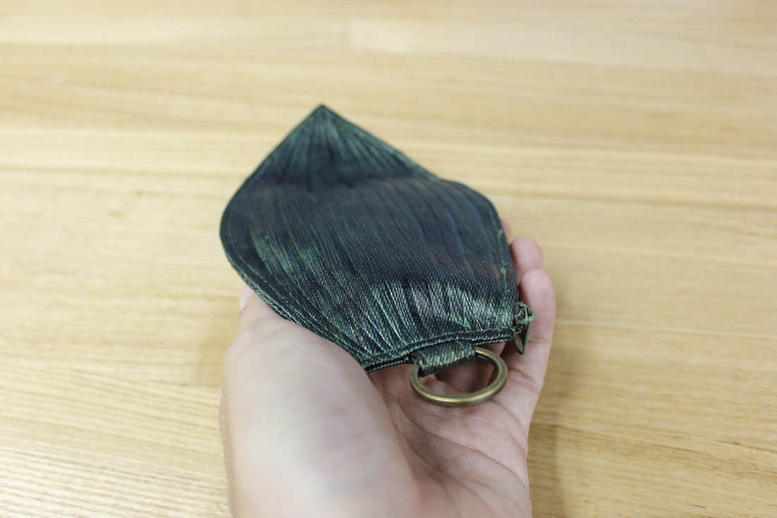 コインケースの中にコインや小物を入れると、パスケースの中心がこんもりと膨らむようになっています。そうすることで、より蓮台についている蓮弁のようなフォルムになるように計算して製作しています。