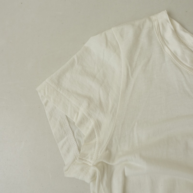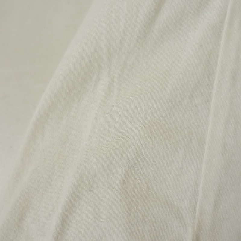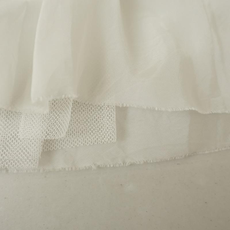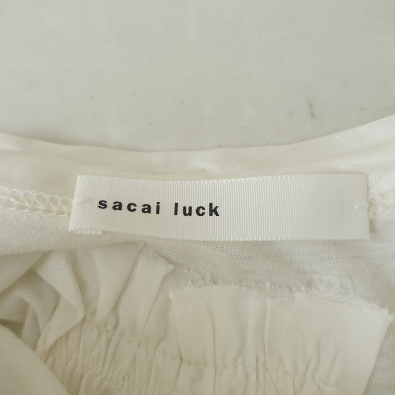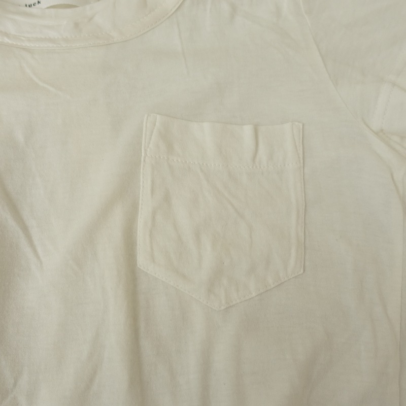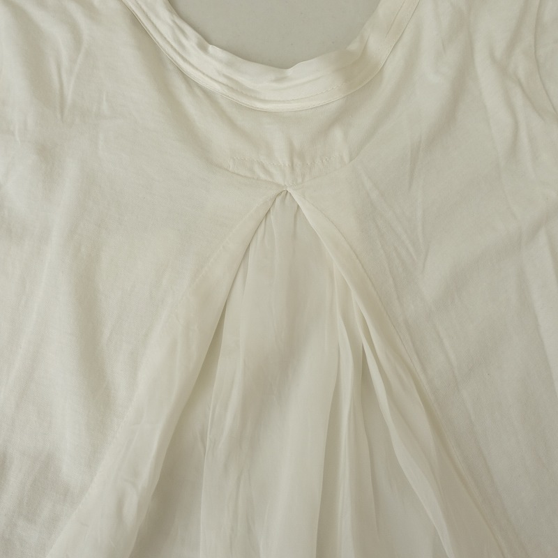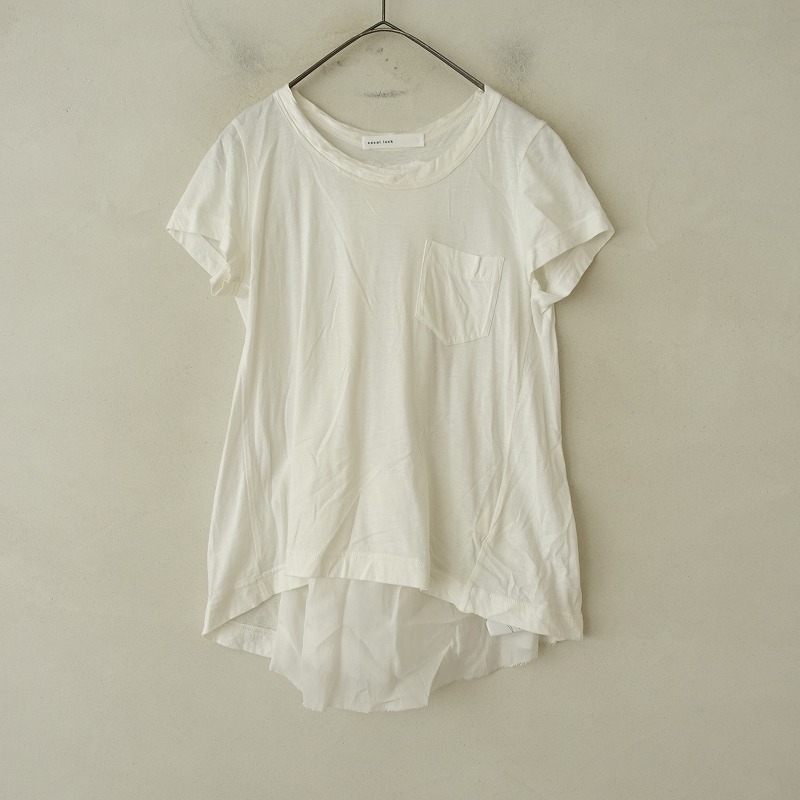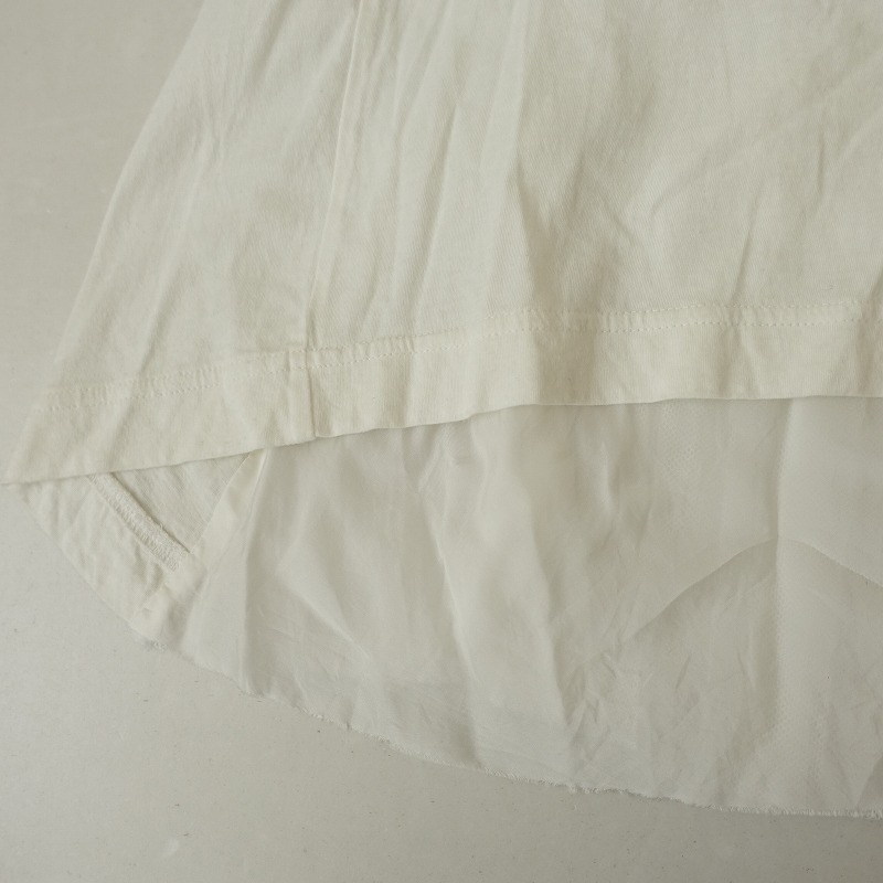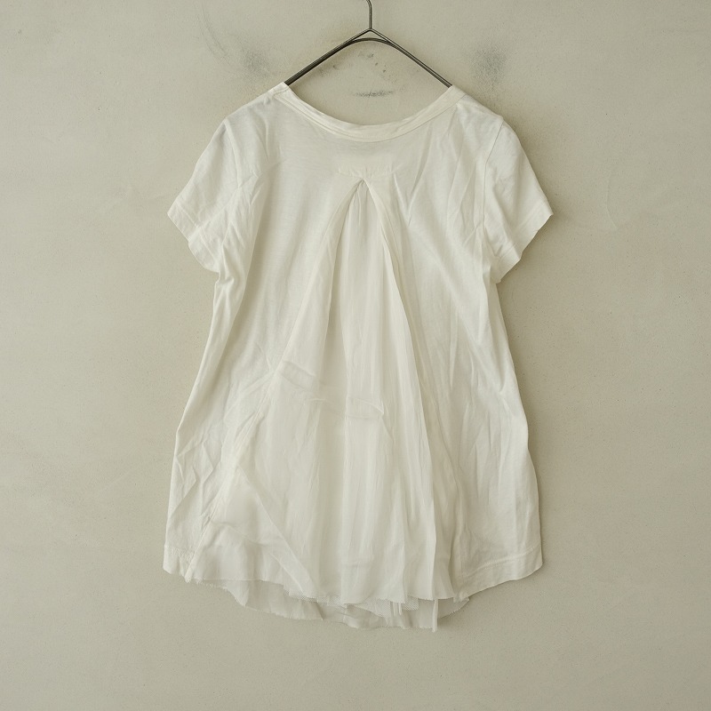 | sacai luckのバック異素材切替Tシャツです。カラーはオフホワイトで、薄手のカットソー素材です。プルオーバータイプで、左胸にポケットがございます。ネックラインは別布になっており、バックにインバーテッドタック風で裾縁が裁ち切りのレイヤードの異素材切替が施されており、切替部分2枚の間の裾中央チュールレースがあしらわれております。 |