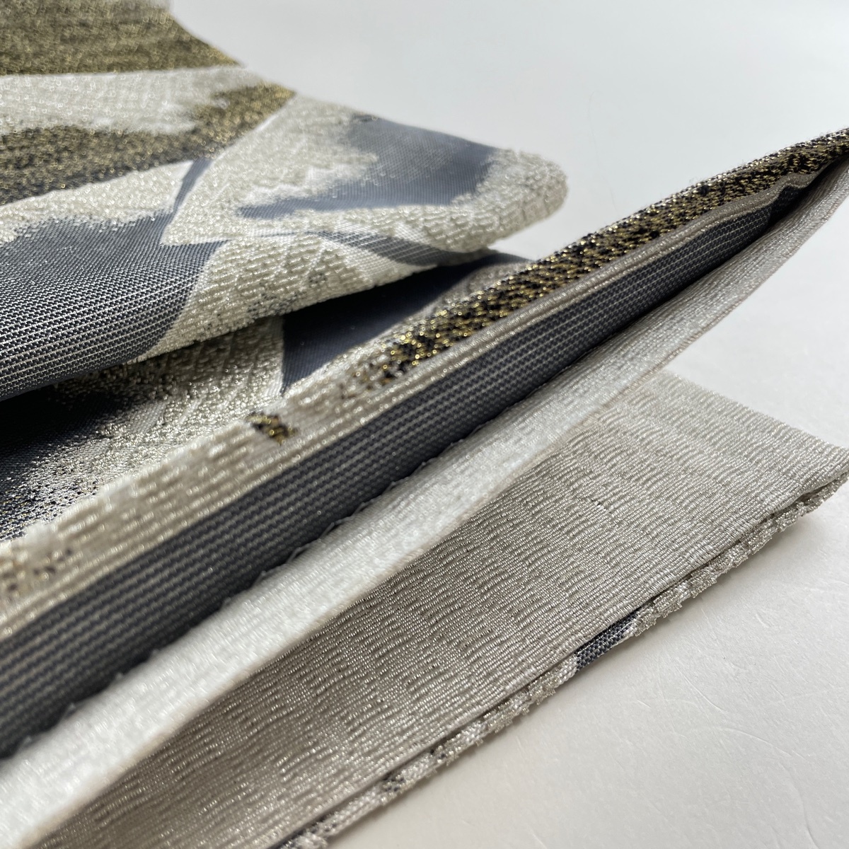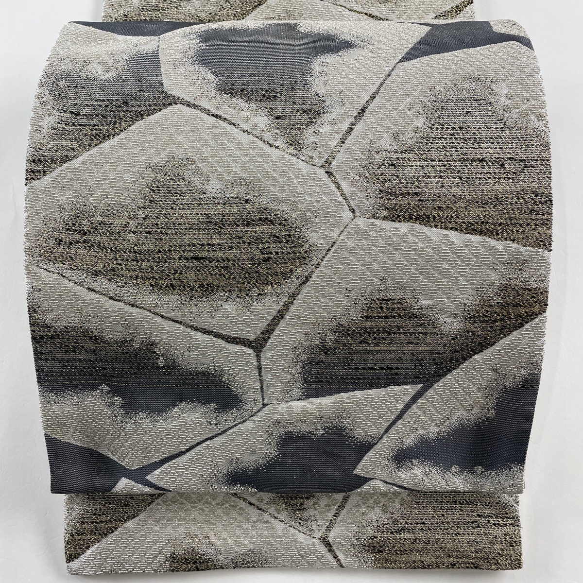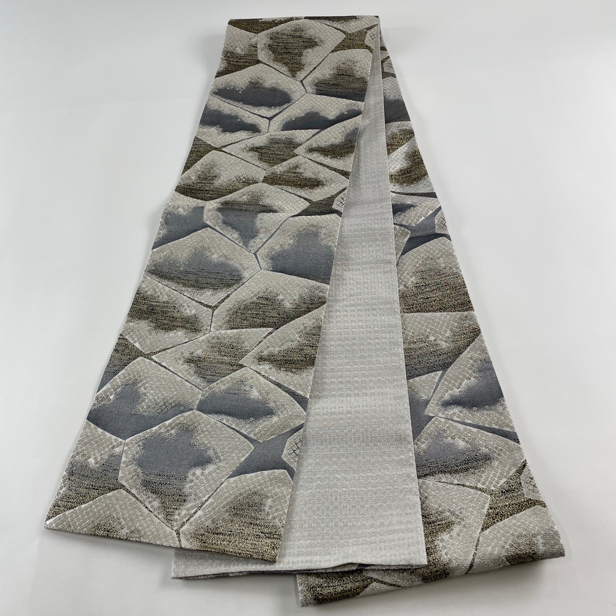 | 袋帯 美品 名品 幾何学 輪奈織 銀糸 灰白 全通 正絹 【中古】 |