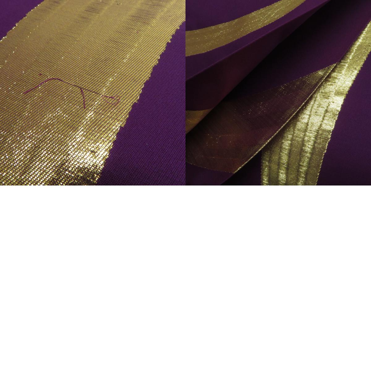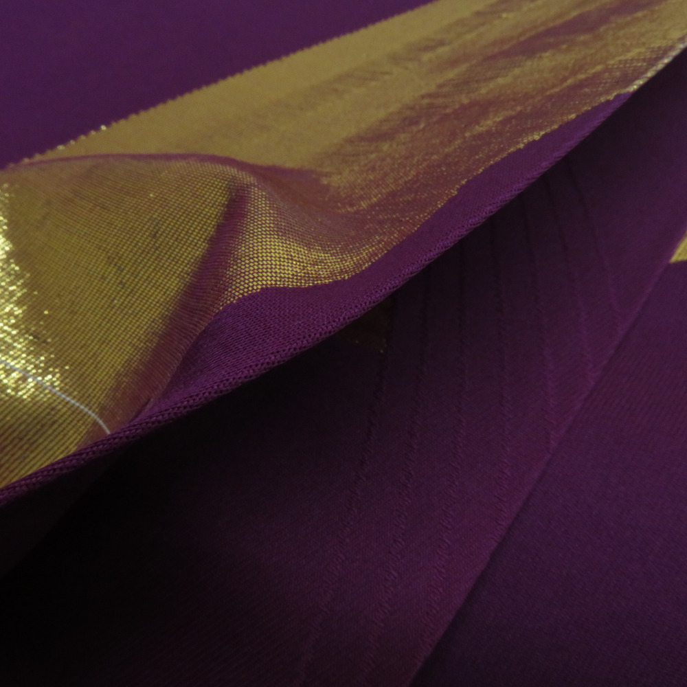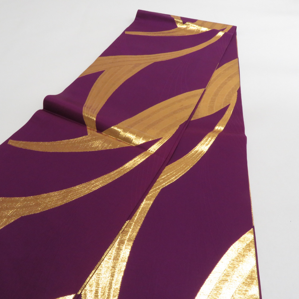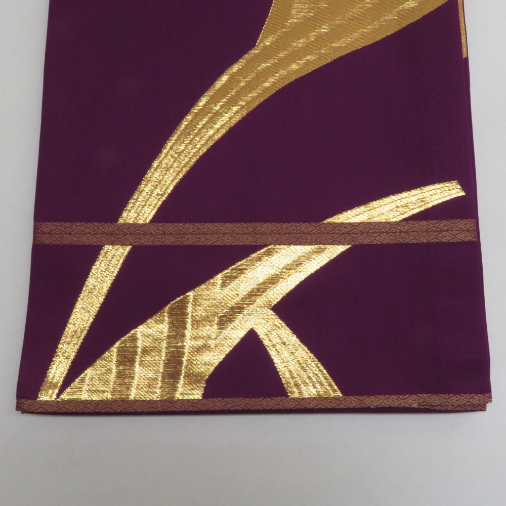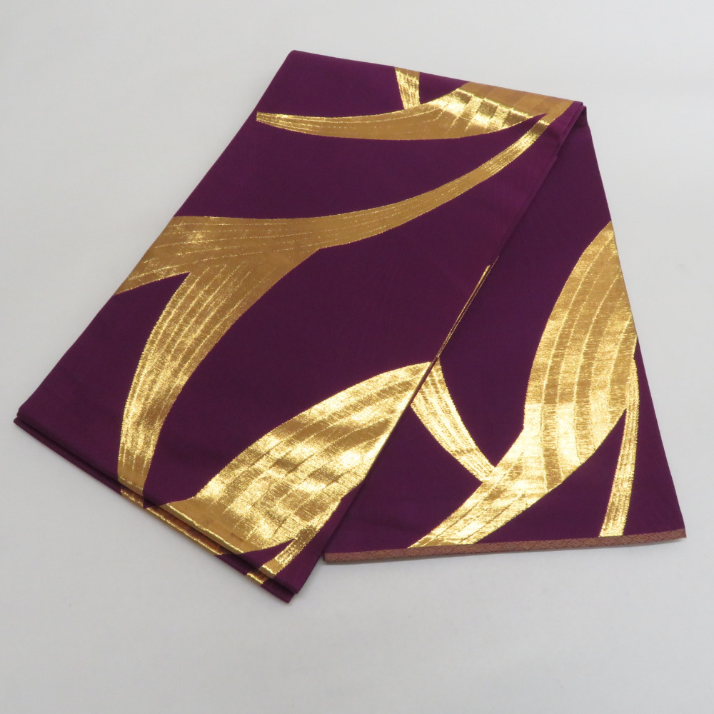 丸帯 正絹 金糸 紫色x金色 両面 波模様 全通 仕立上がり 長さ448cm |