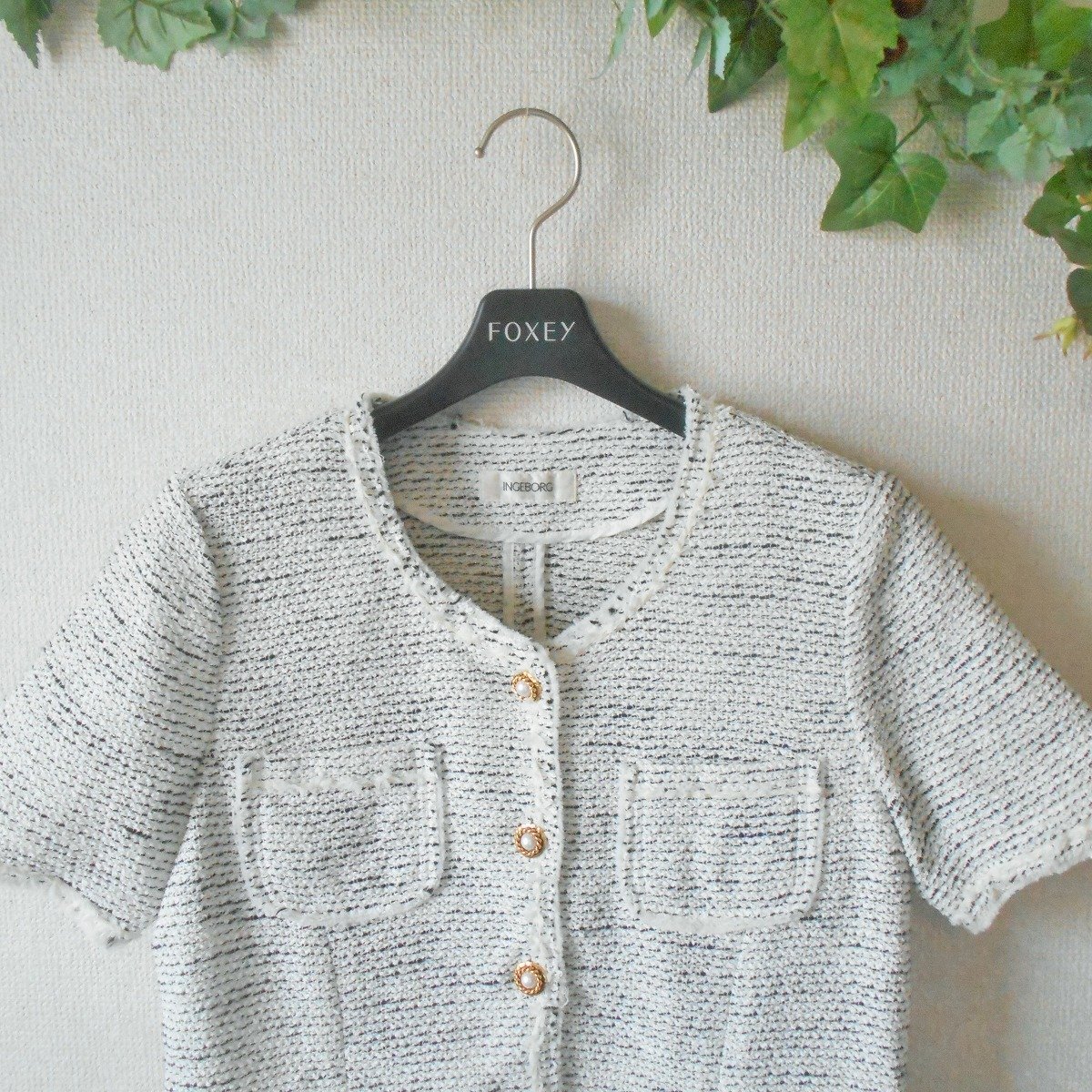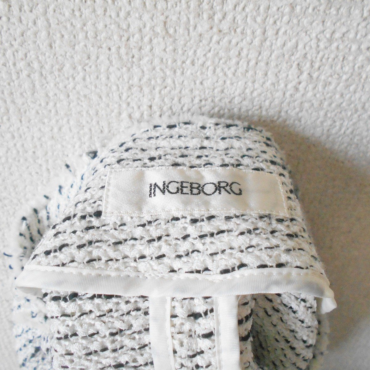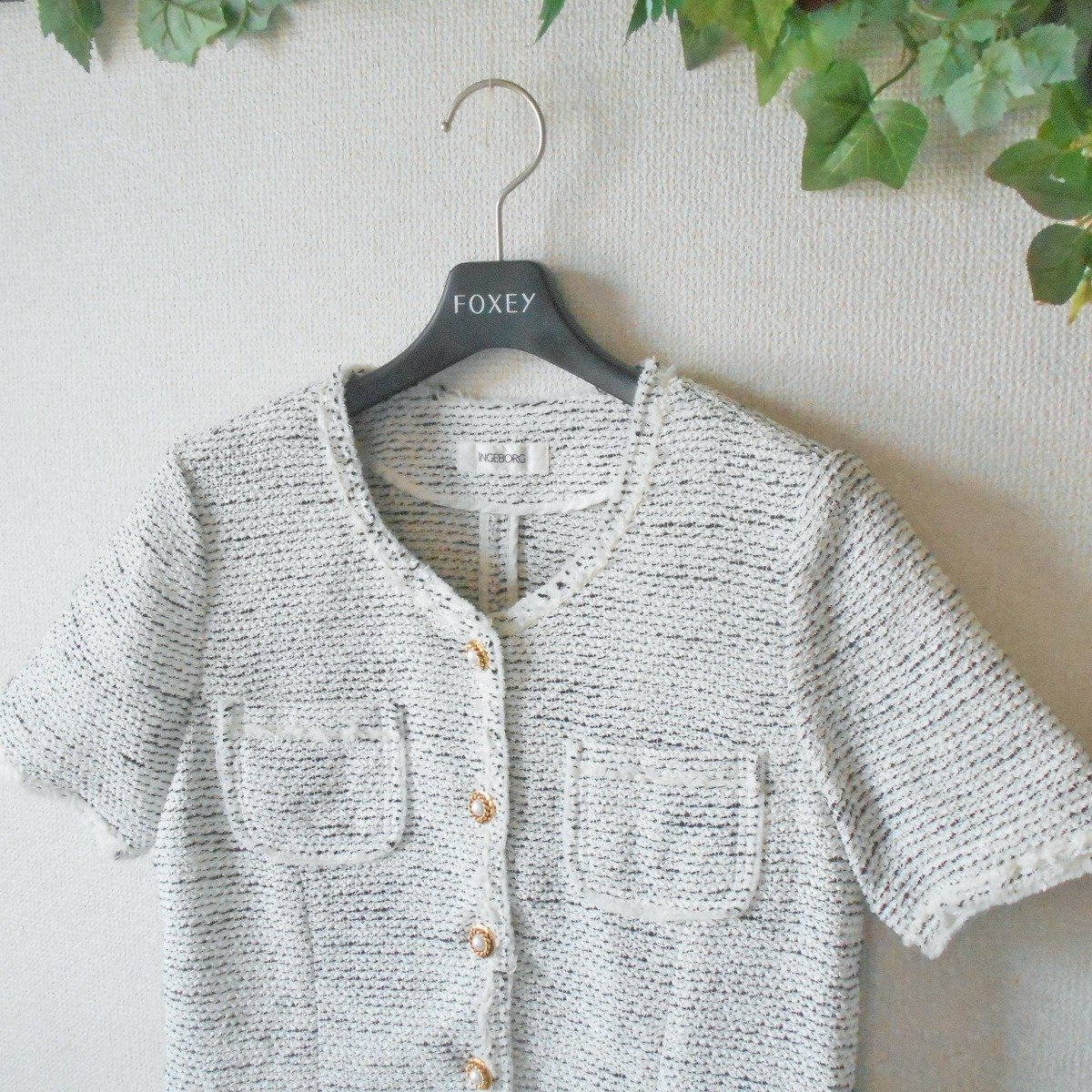 【ポイント】インゲボルグのノーカラージャケットになります。お色は白ベースに黒色の糸が編み込まれています。夏を中心に着ていただけるお品です。