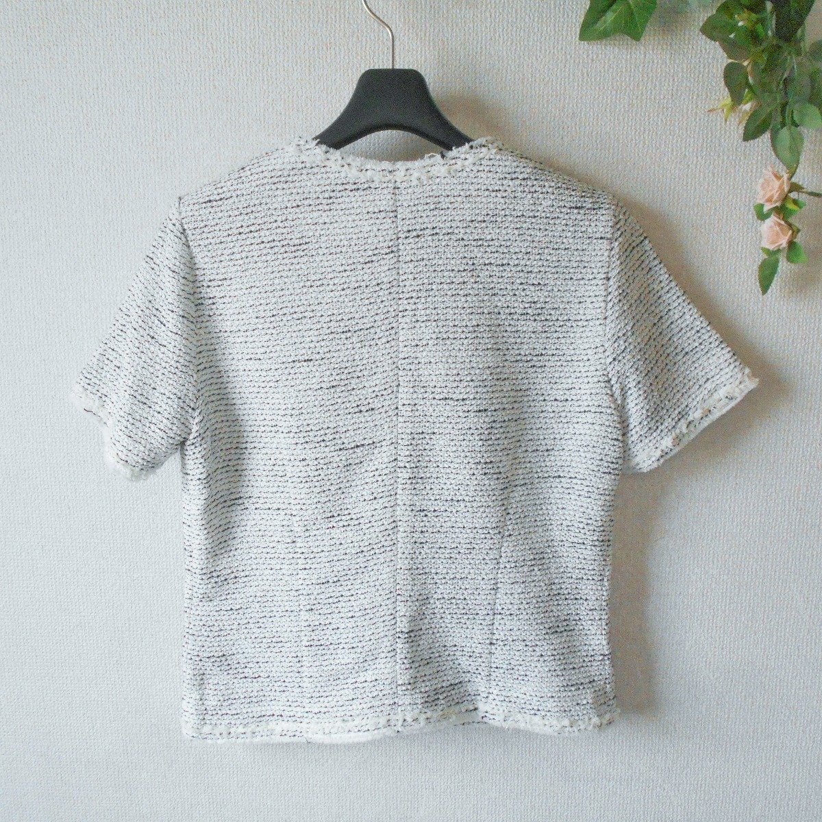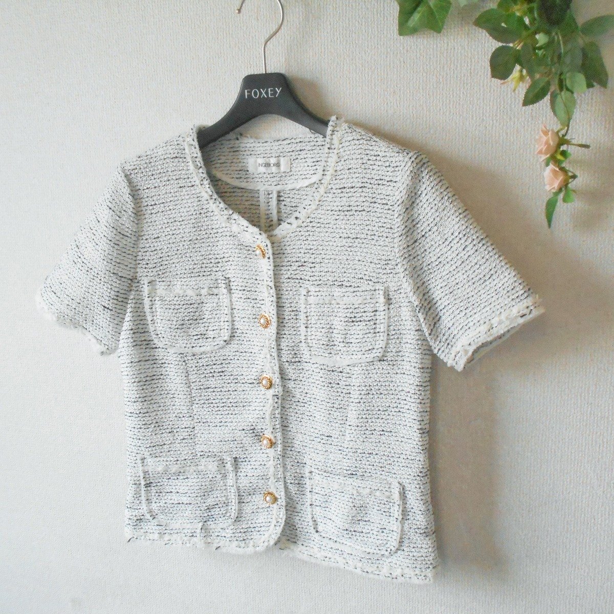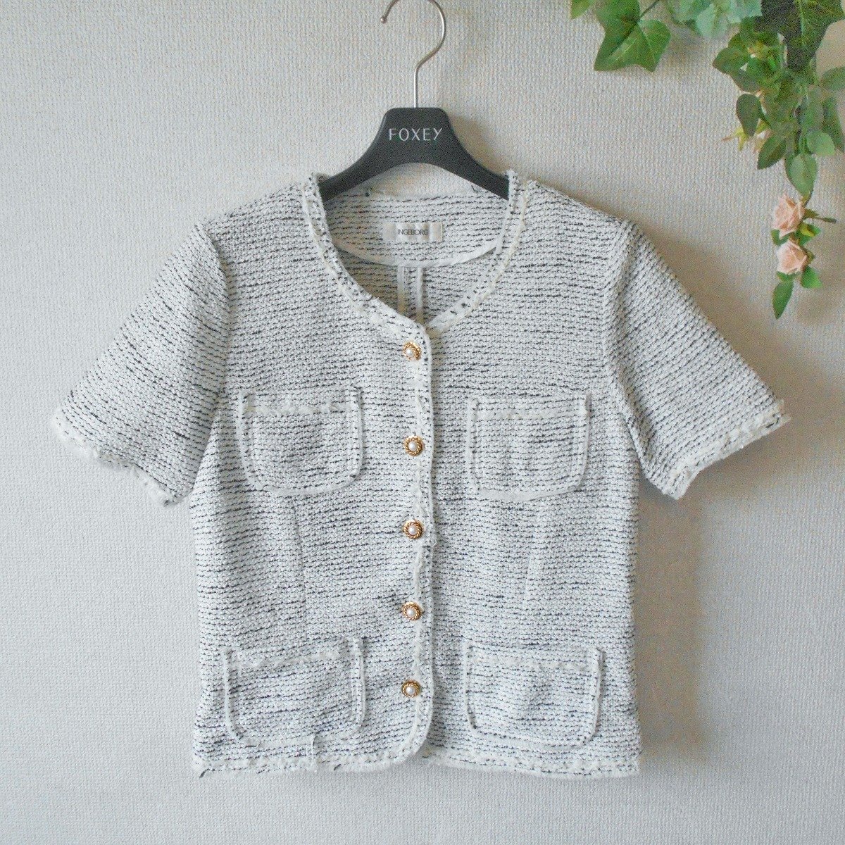 【ポイント】インゲボルグのノーカラージャケットになります。お色は白ベースに黒色の糸が編み込まれています。夏を中心に着ていただけるお品です。