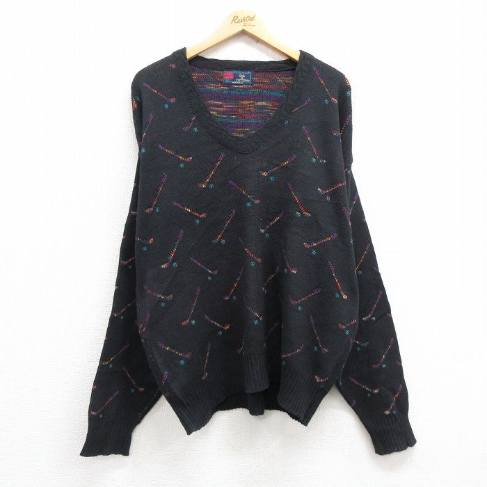 【商品名】 XL★古着 長袖 セーター メンズ 90年代 90s ゴルフ コットン Vネック USA製 黒