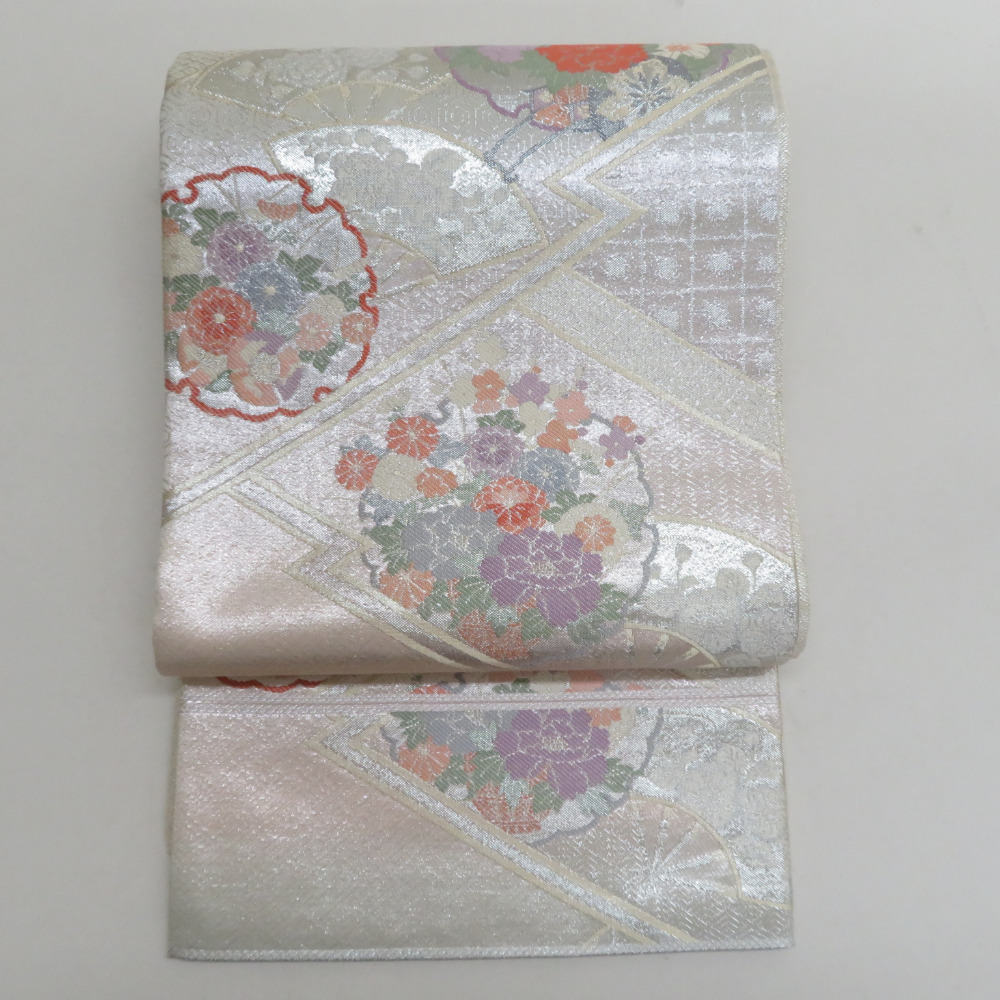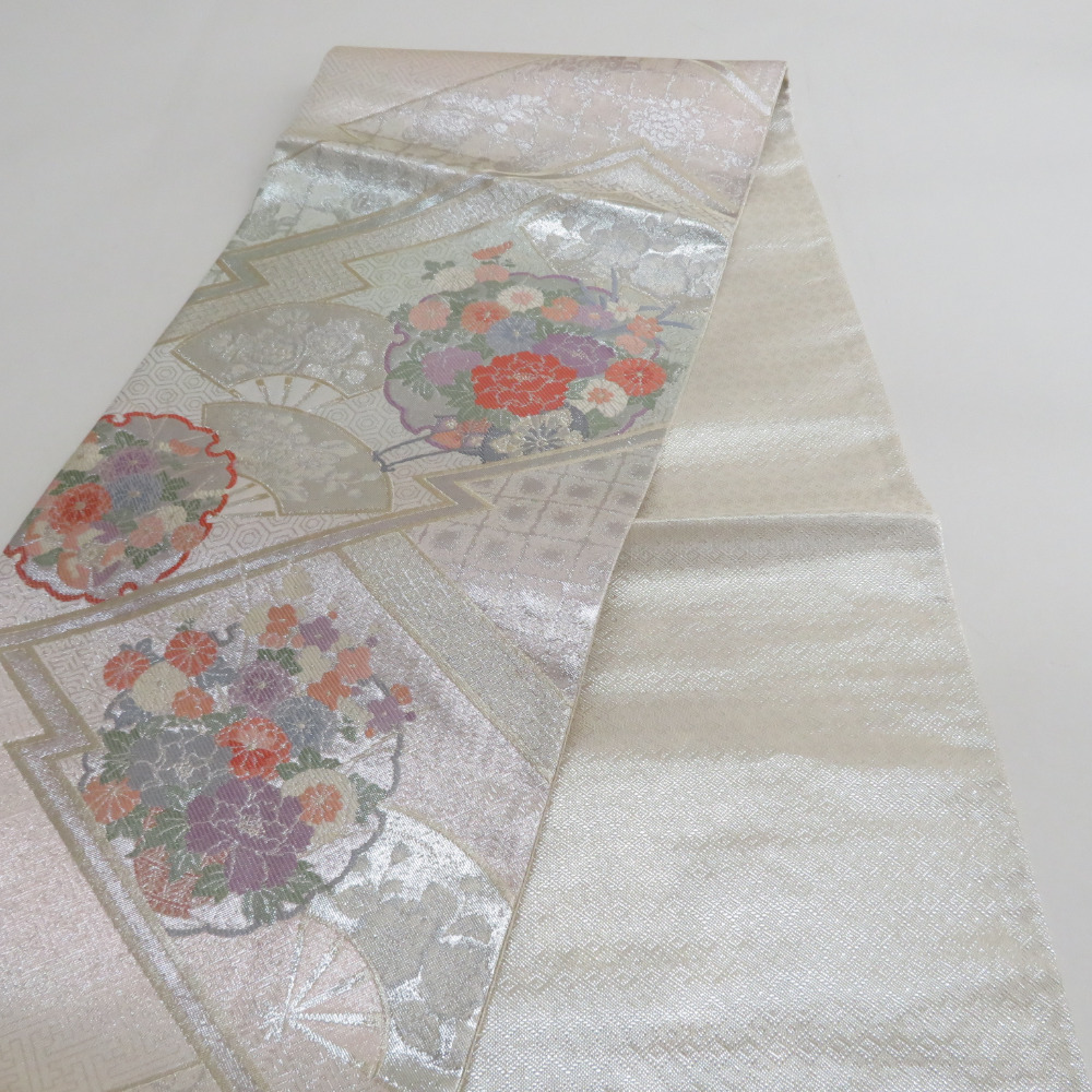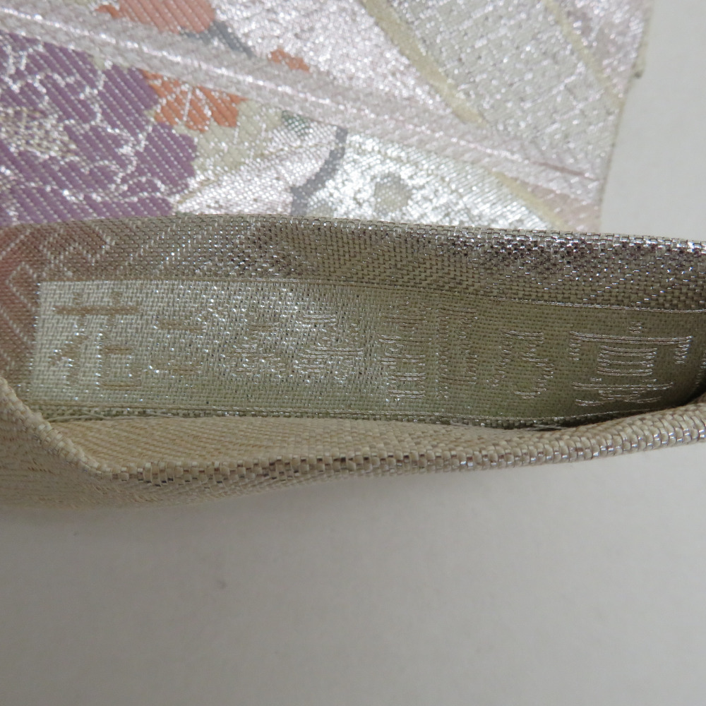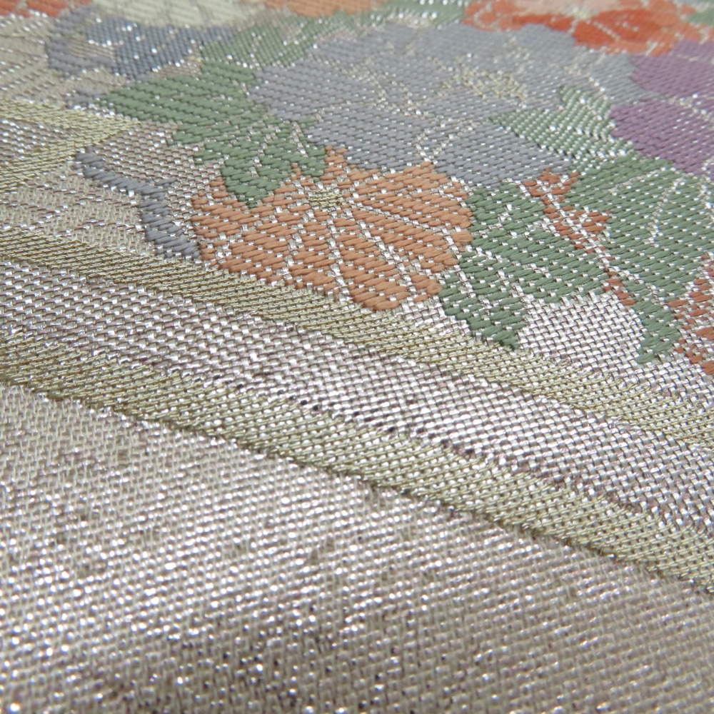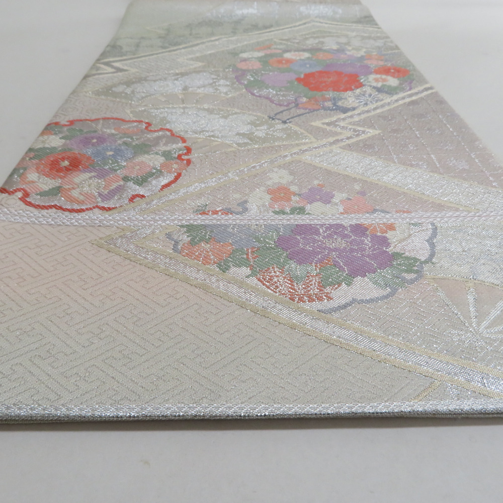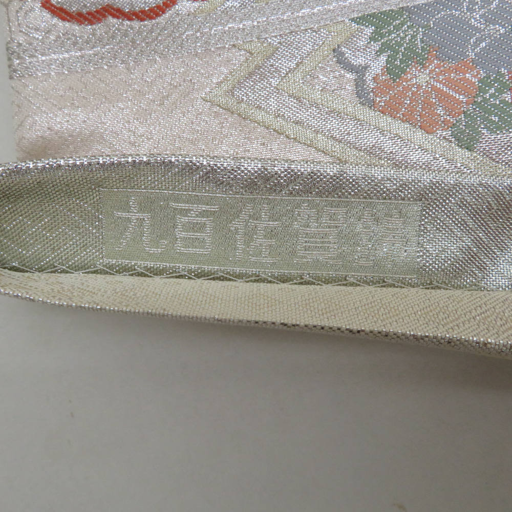 | 袋帯 九百佐賀錦 花ごよみ都乃宴 銀糸 雪輪に花々など シルバー系 銀色x薄インク色x多色 正絹 仕立て上がり 長さ448cm |