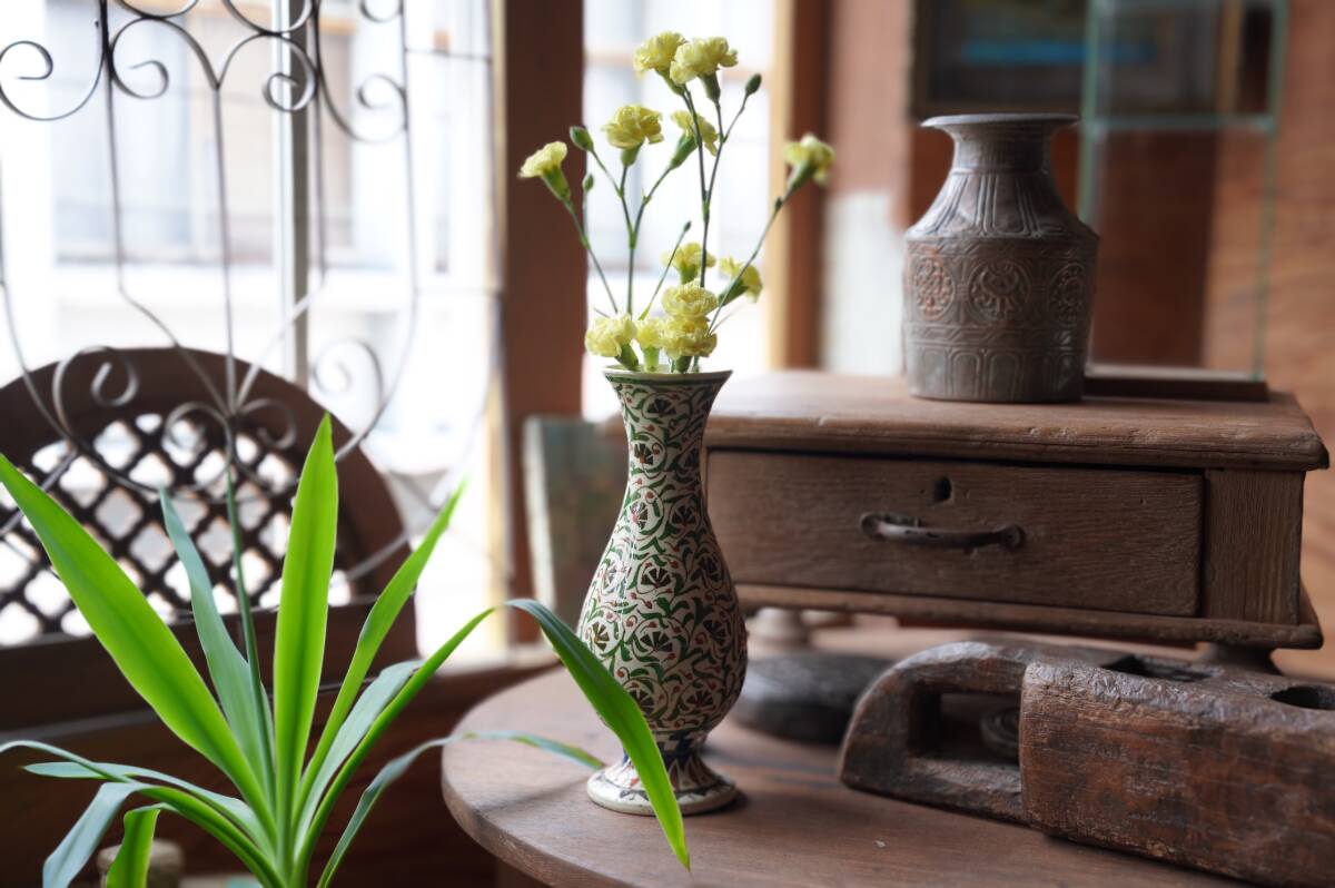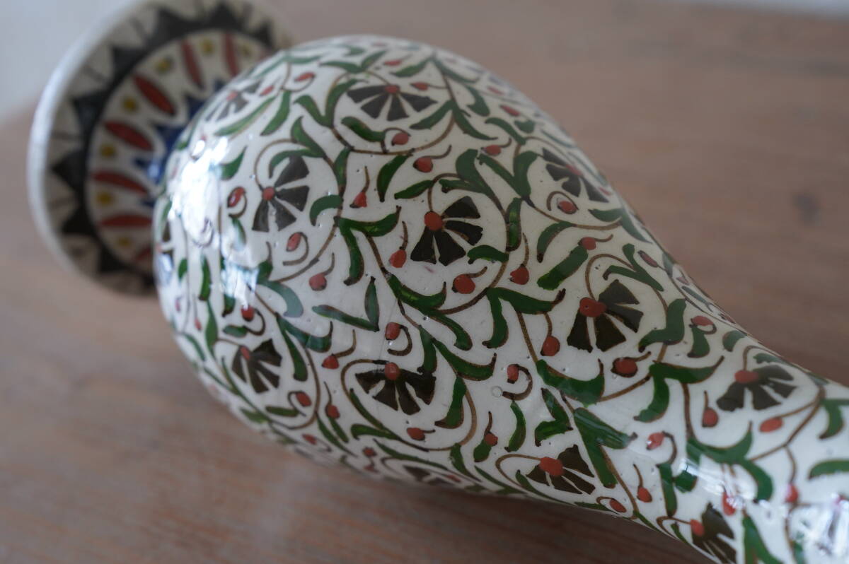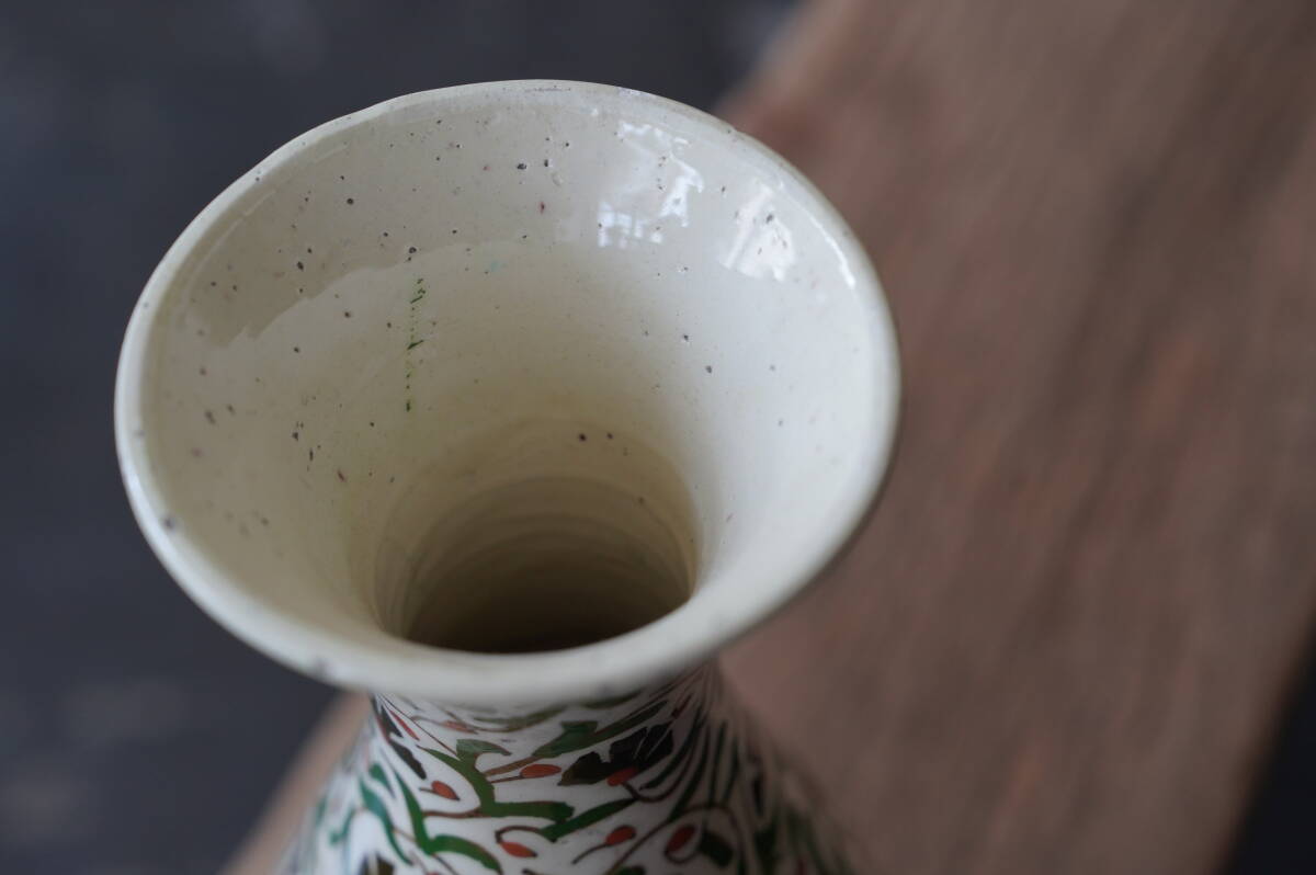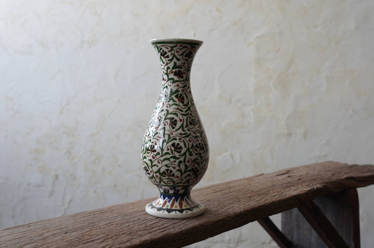 全体に素朴で伸び伸びとしたアラビックなフラワーペイントが手描きで施された、とても可愛らしい花器です。