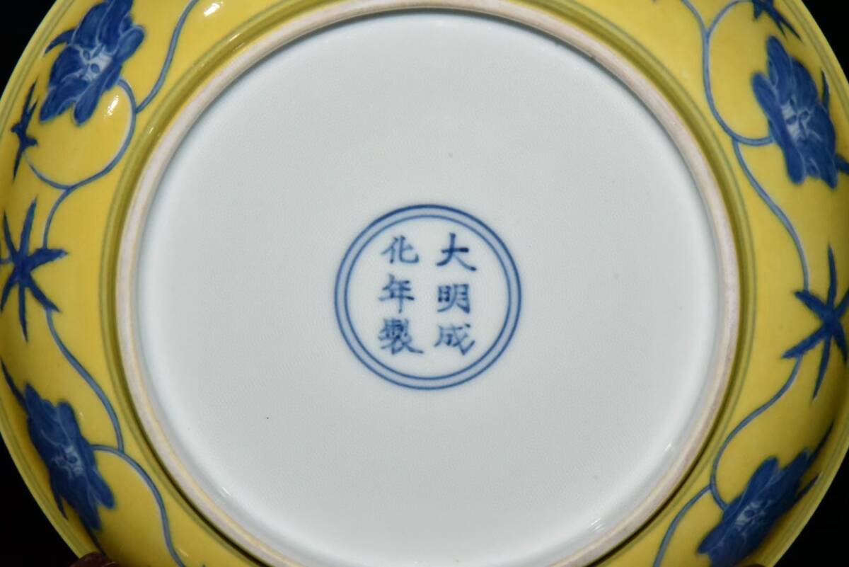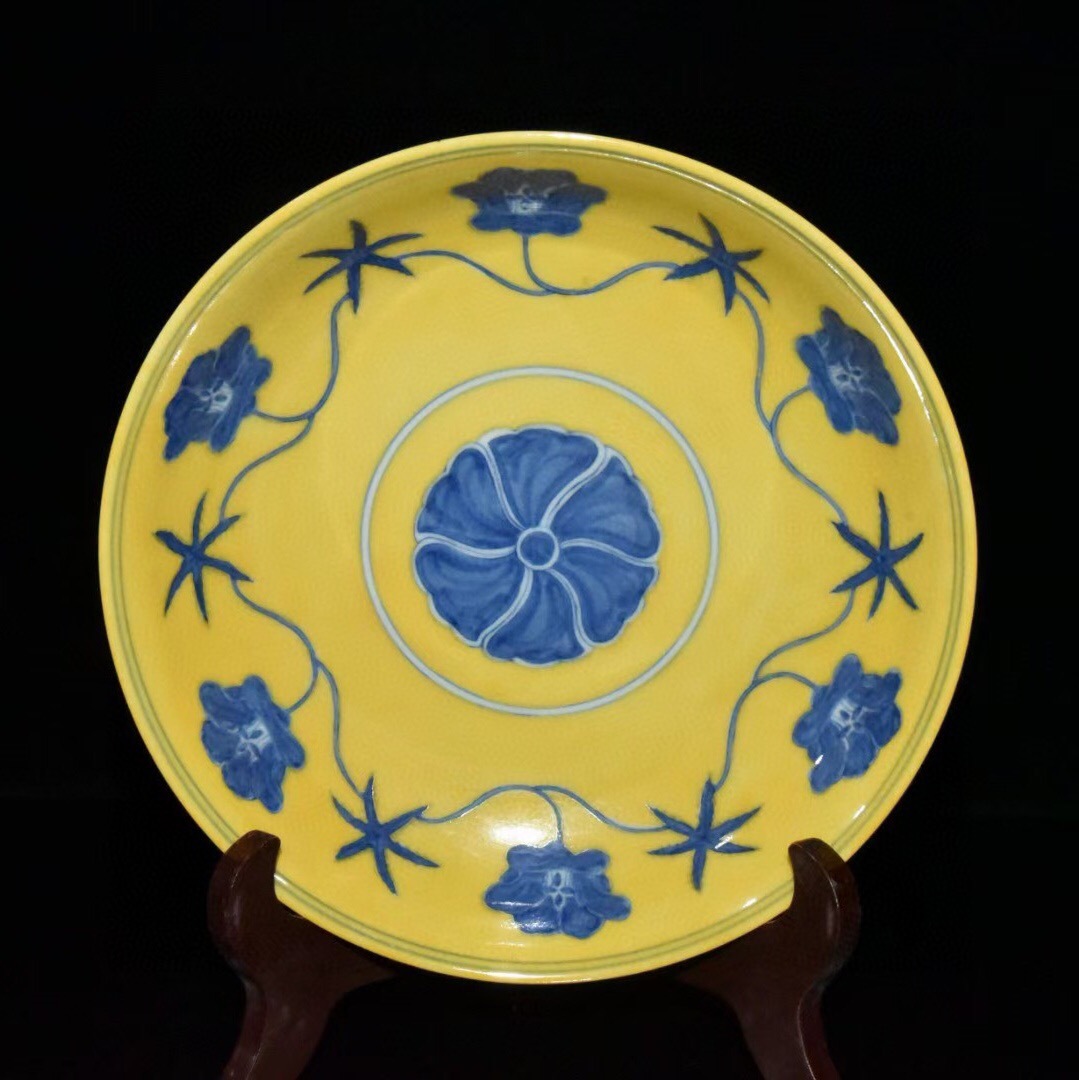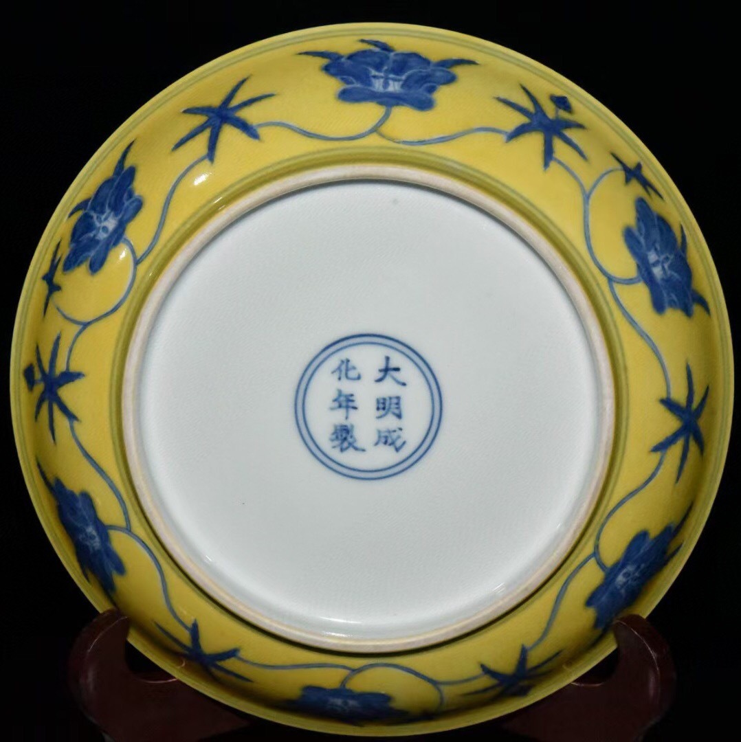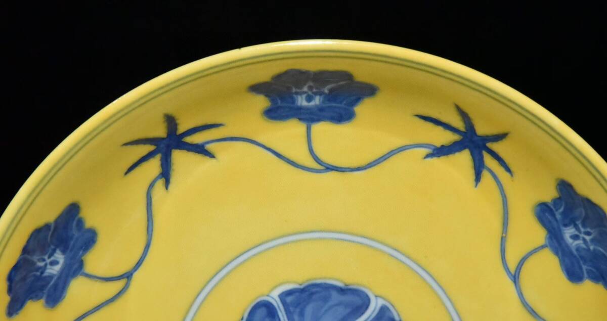 【超珍館蔵】明 成化年製款 古陶瓷品 黄釉 青花 秋葵紋 供盤 陶藝 古賞物 古董品 古美術品 時代物 旧家蔵出 稀少珍蔵品