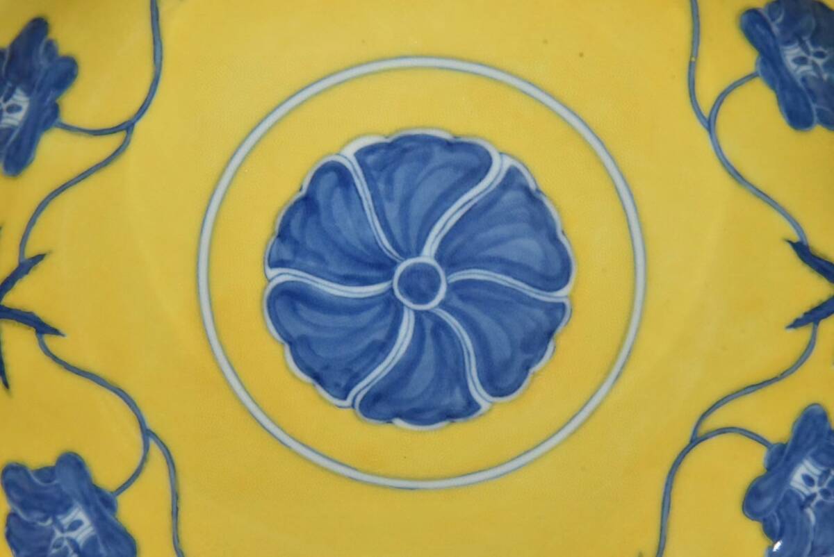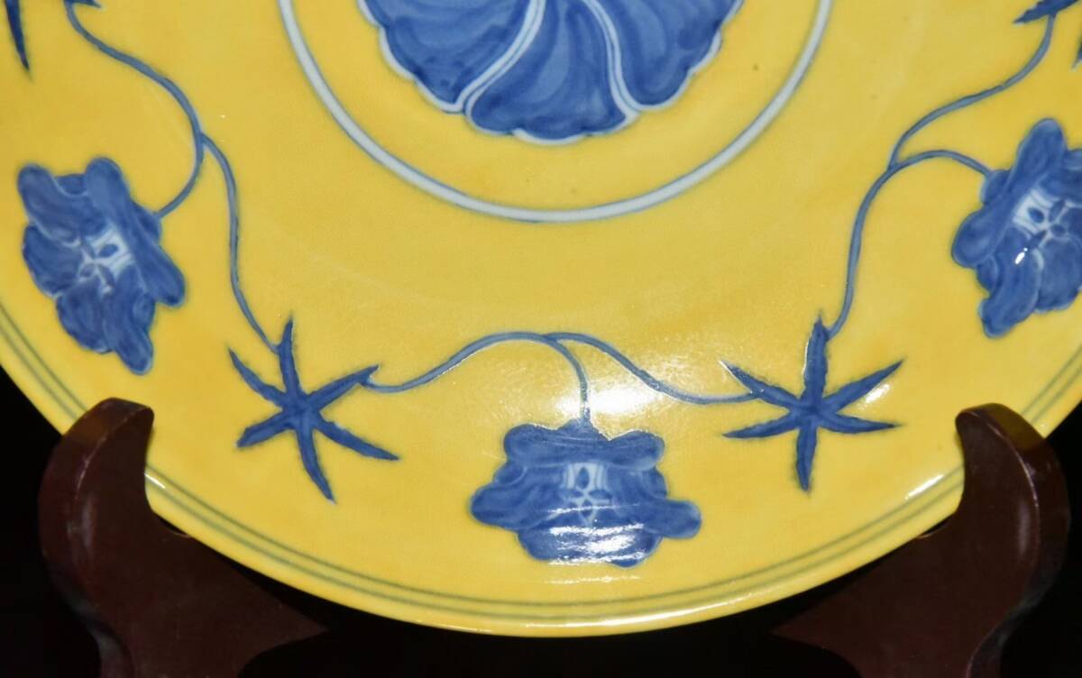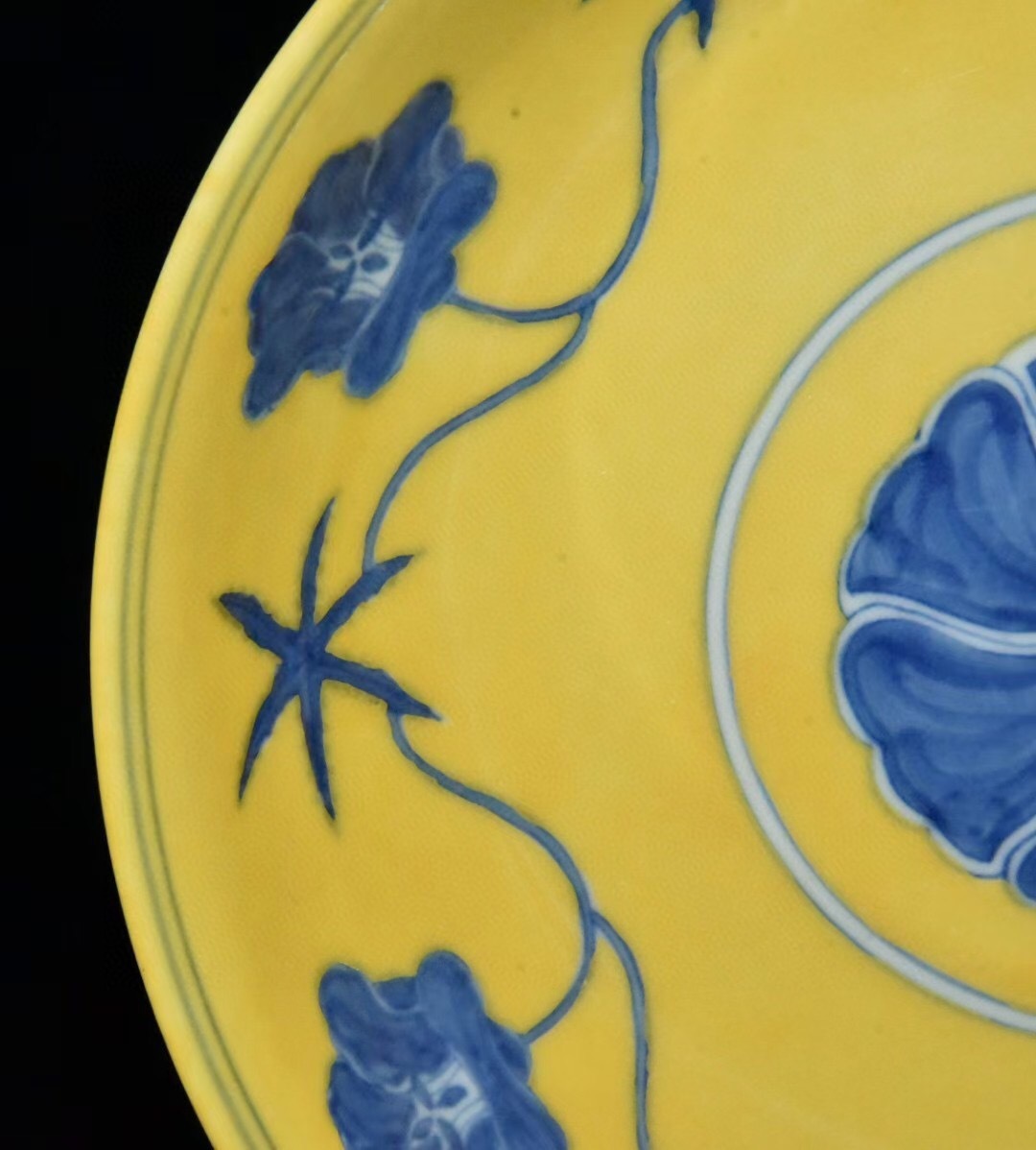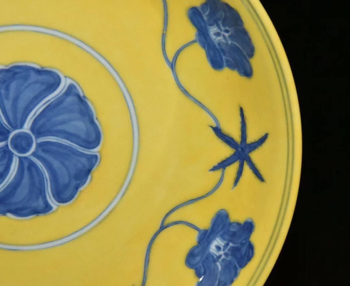 【超珍館蔵】明 成化年製款 古陶瓷品 黄釉 青花 秋葵紋 供盤 陶藝 古賞物 古董品 古美術品 時代物 旧家蔵出 稀少珍蔵品