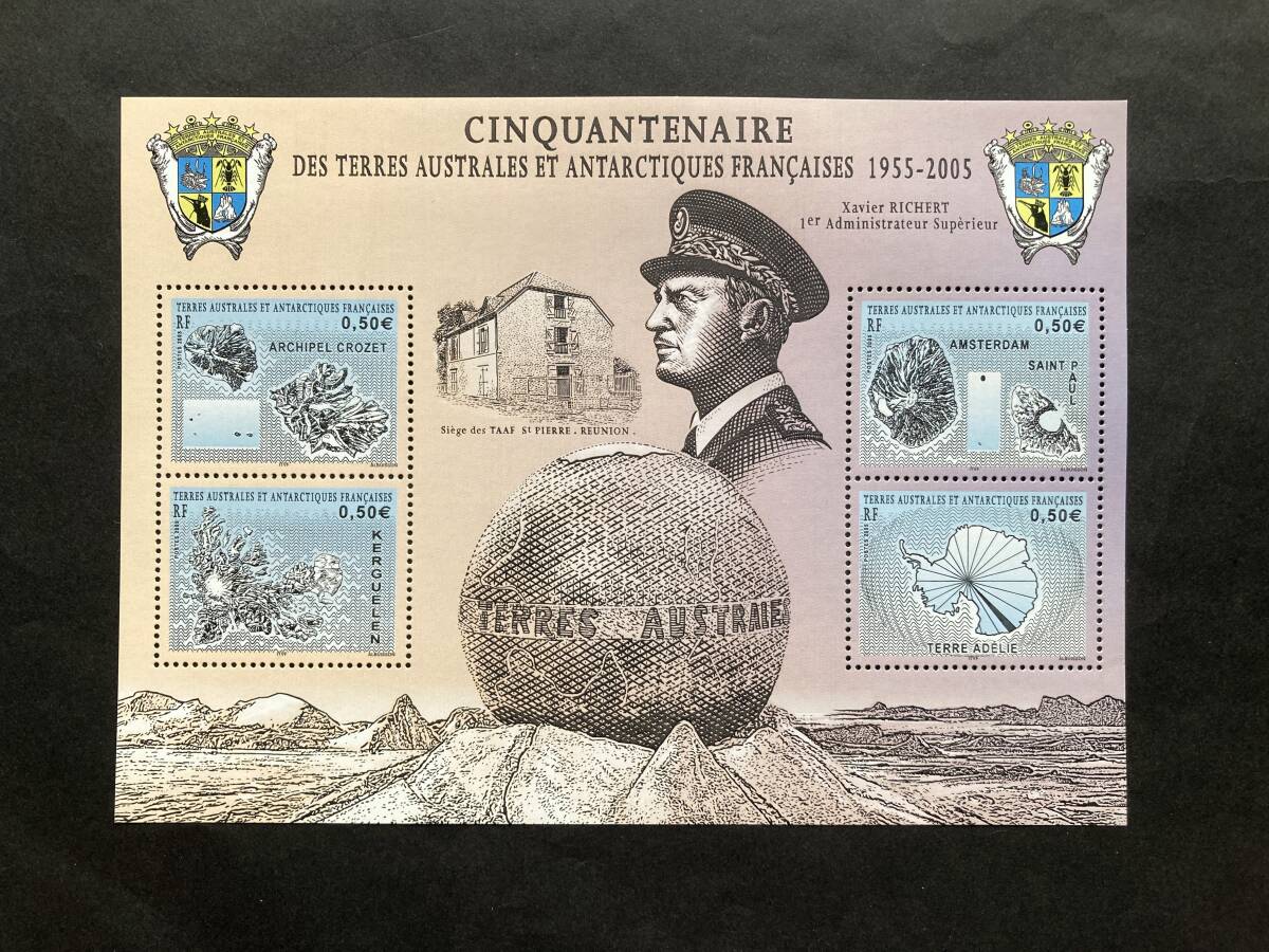 仏領南方南極地域 2005年 発行  「TAAF(仏領南方南極地域)50年」 小型シート 未使用、NH(ヒンジ跡無)、糊付です。