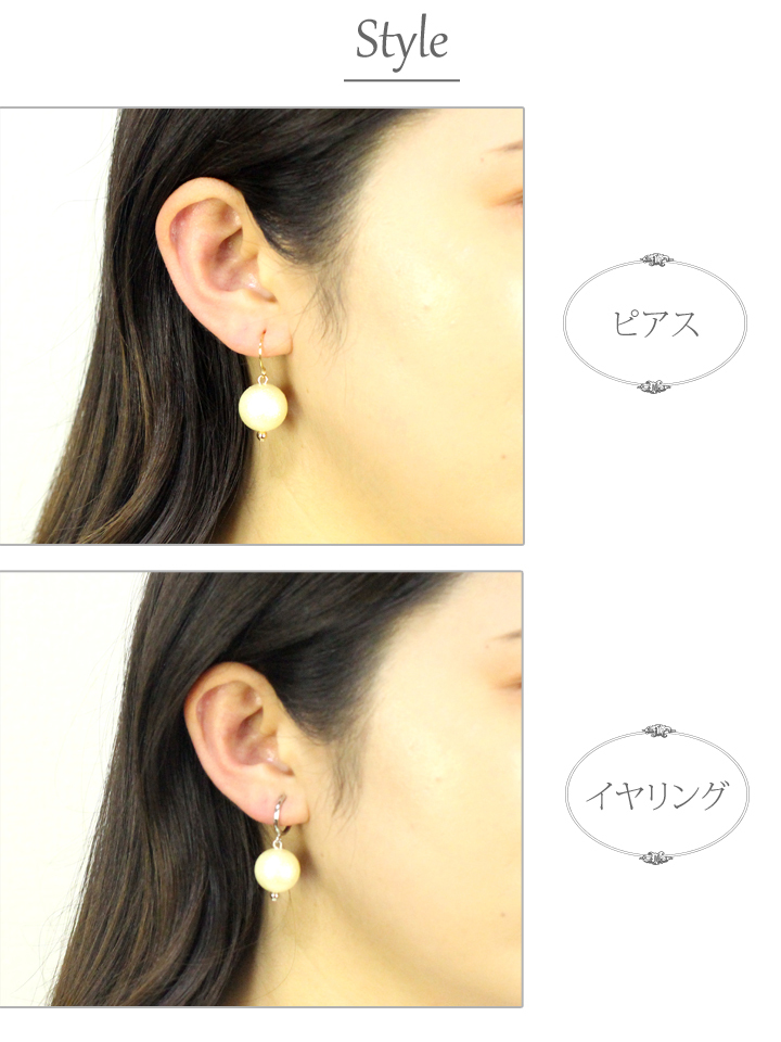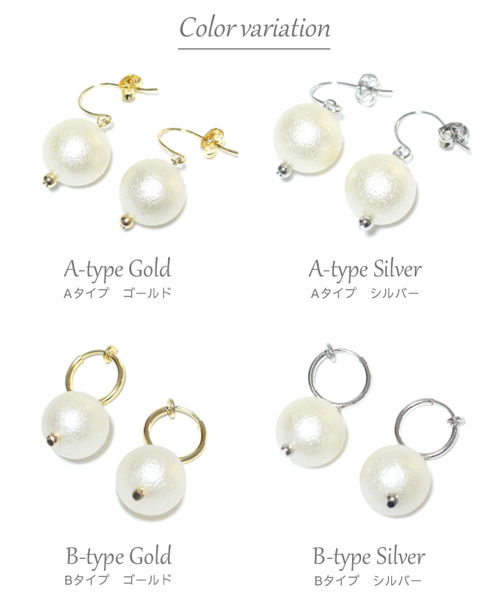 サイズ | Aタイプ(ピアス)・・・フック全長3.5cm パール直径1.3cm Bタイプ(イヤリング)・・・フープ直径1.1cm パール直径1.3cm |