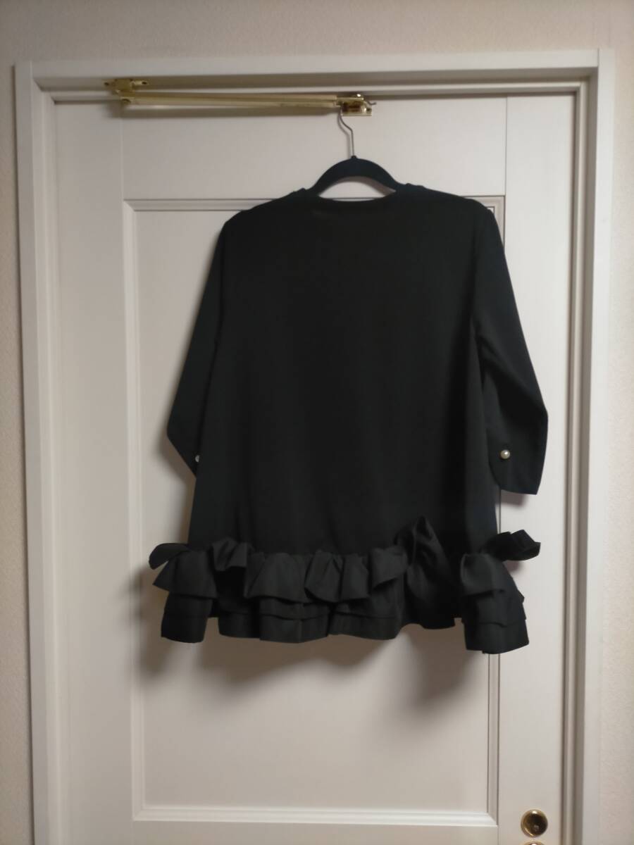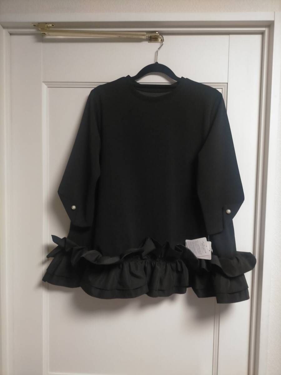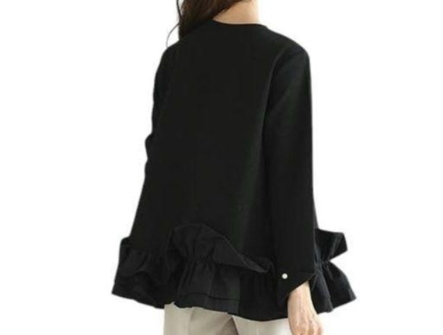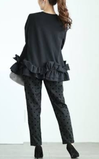 適度な生地厚で伸縮性のあるAラインのカットソーと、異素材切り替えにしたシャーリングフリルがドッキングした素敵なデザインです。