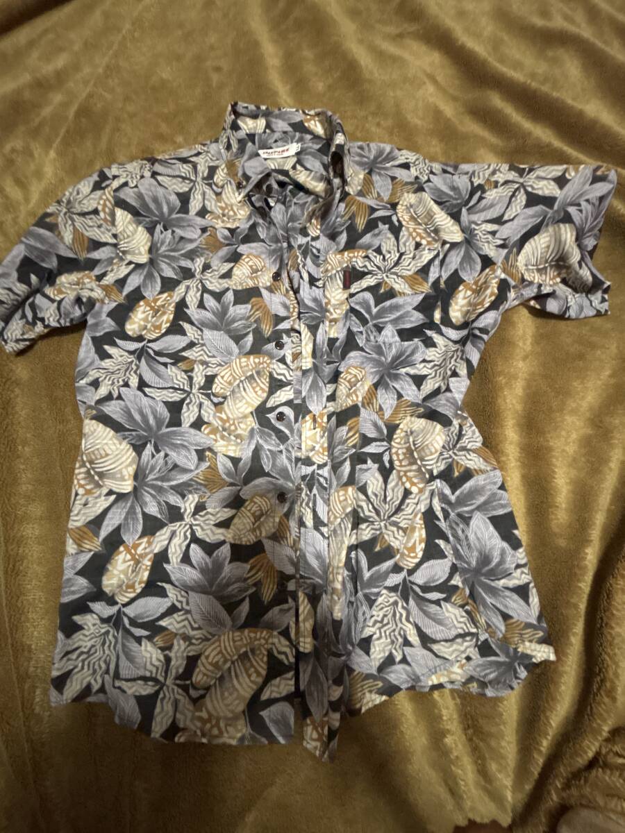 出品品は1、2番目の画像のシャツです。その他の画像は自身が着用した柄違いを参考に掲載しました。とても薄手の素材で軽く着心地の良いシャツです。洗濯してもシワになりにくく薄手でありながら色、柄のせいで透け感がそれほどありません。洗濯は洗い、すすぎ、脱水の時間を短くしていました。タンス保管品です宜しくお願いします。