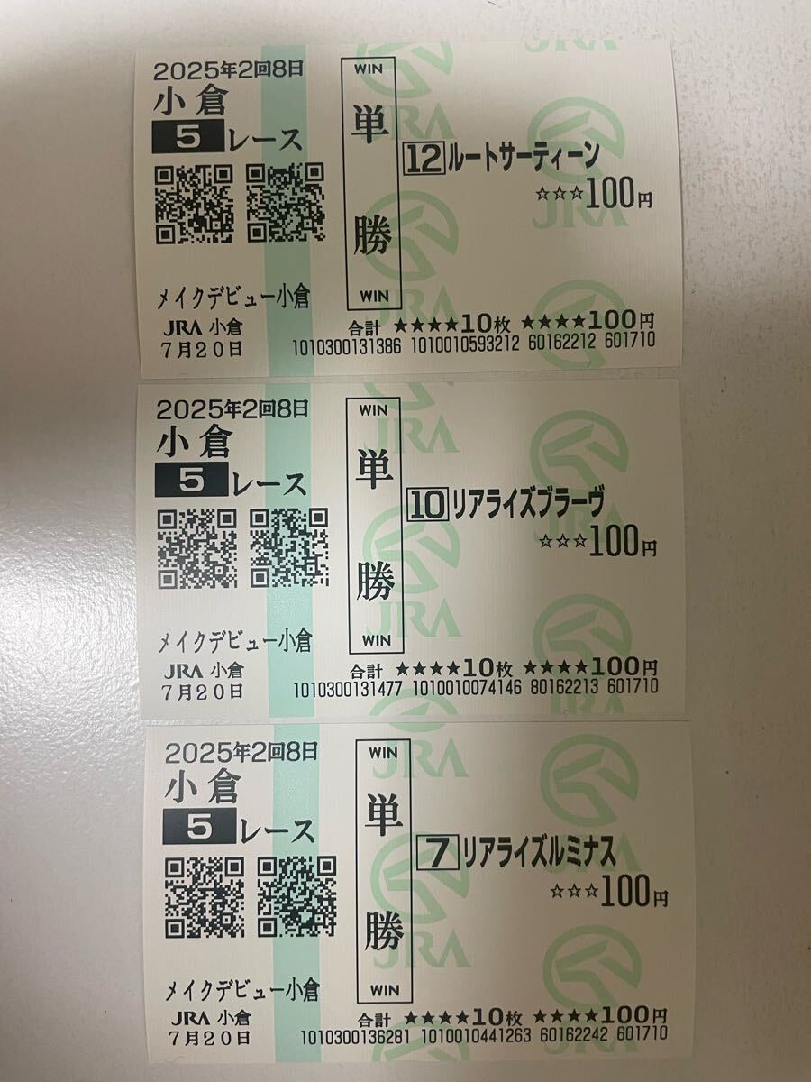 ベレシート メイクデビュー小倉 現地的中単勝馬券 2着ロードフィレール、3着ルートサーティーン、4着リアライズブラーヴ、5着リアライズルミナスのセット