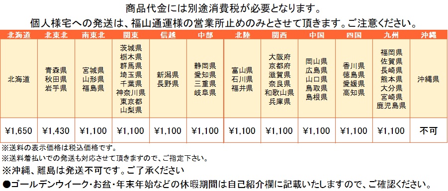 ●発送は福山通運様のみになります。 【個人様宅への発送は、福山通運様の営業所止めのみとさせていただきます。ご注意ください】 都市部や狭い道等、大型商品の配達制限がかけられている地域への大型商品の発送は法人様の場合でも営業所止めの発送になります。 法人様の場合は必ず会社名を記載してください。会社名の無い場合は個人様宅扱いになります。 法人様の場合でもマンションやアパートの一室、一軒家の場合は個人様宅扱いとなります。 一部のショッピングモール等の大型商業施設や大型倉庫施設等への発送は、法人様でも営業所止めでの発送になります。 法人様でも日曜・祝日の配達は出来ません、ご了承ください。 発送完了後に会社名の連絡を頂きましても変更できませんのであらかじめご了承ください。 ●沖縄・離島は発送不可です。 ●12時以降のご入金は翌営業日発送になります。 |