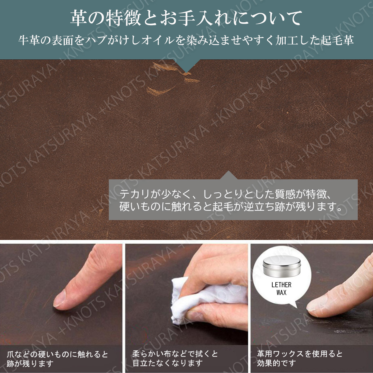牛革の表面をハブ掛けしオイルを染み込ませやすく加工した起毛革を使用しています。光沢が少なく、しっとりとした質感が特徴です。硬いものに触れると起毛が逆立ち跡が残りますが、柔らかい布などで軽く拭くと目立たなくなります。革用ワックスなどを使用すると質感が保たれ効果的、エイジングをお楽しみいただけます。