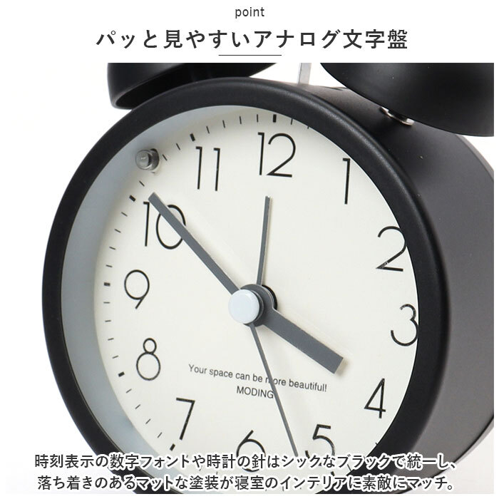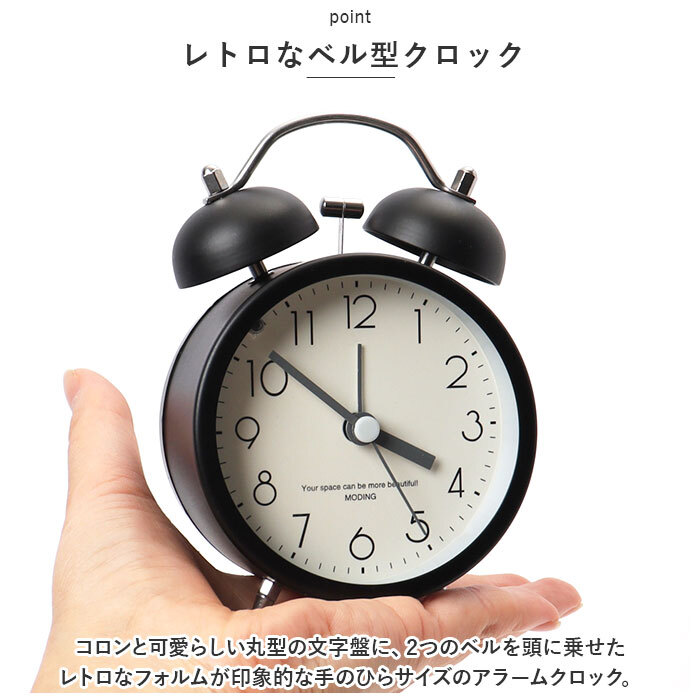 | 商品説明 | ・・ポップな色使いと、どこか懐かしい雰囲気が静かなおうち時間にフィット!シンプルで見やすい「アナログ置き時計」が新登場。 ・【レトロなベル型クロック】 ・コロンと可愛らしい丸型の文字盤に、2つのベルを頭に乗せたレトロなフォルムが印象的な手のひらサイズのアラームクロック。 ・【パッと見やすいアナログ文字盤】 ・時刻表示の数字フォントや時計の針はシックなブラックで統一し、落ち着きのあるマットな塗装が寝室のインテリアに素敵にマッチ。 ・【アラームですっきりウェイクアップ】 ・・「ジリリリッ」と鳴り響くレトロなベル音の大音量アラームで、早起きの苦手なお寝坊さんでも毎朝の目覚めがスッキリ爽快。(※アラーム時刻設定用の目盛りは12分単位になります。アラーム設定をする際にお気をつけください。) ・【おやすみ時間を妨げない連続秒針】 ・就寝中や読書中など、快適なリラックスタイムを妨げない「静音ムーブメント」を採用。秒針の音が気になってしまう方や、自室や書斎でテレワークをされる方にもオススメ。 ・【暗いお部屋でもサッと確認】 ・背面のボタンを押すと、文字盤にほのかに灯りがともるバックライト機能付きなので、照明を暗くした寝室でも時間の確認がスムーズ。 ・【寝室にラクラク持ち運び】 ・ベル部分についたスチールのハンドルに指を掛ければ、寝室やこども部屋など、お気に入りの場所へ持ち運びラクラク。 ・【ご家族みんなで使いやすい♪】 ・シンプルで誰にでも使いやすく、お仕事で毎朝早起きされる方や、お子さまの目覚まし用に最適!(※単3形乾電池1本使用。電池は別売りです。) |