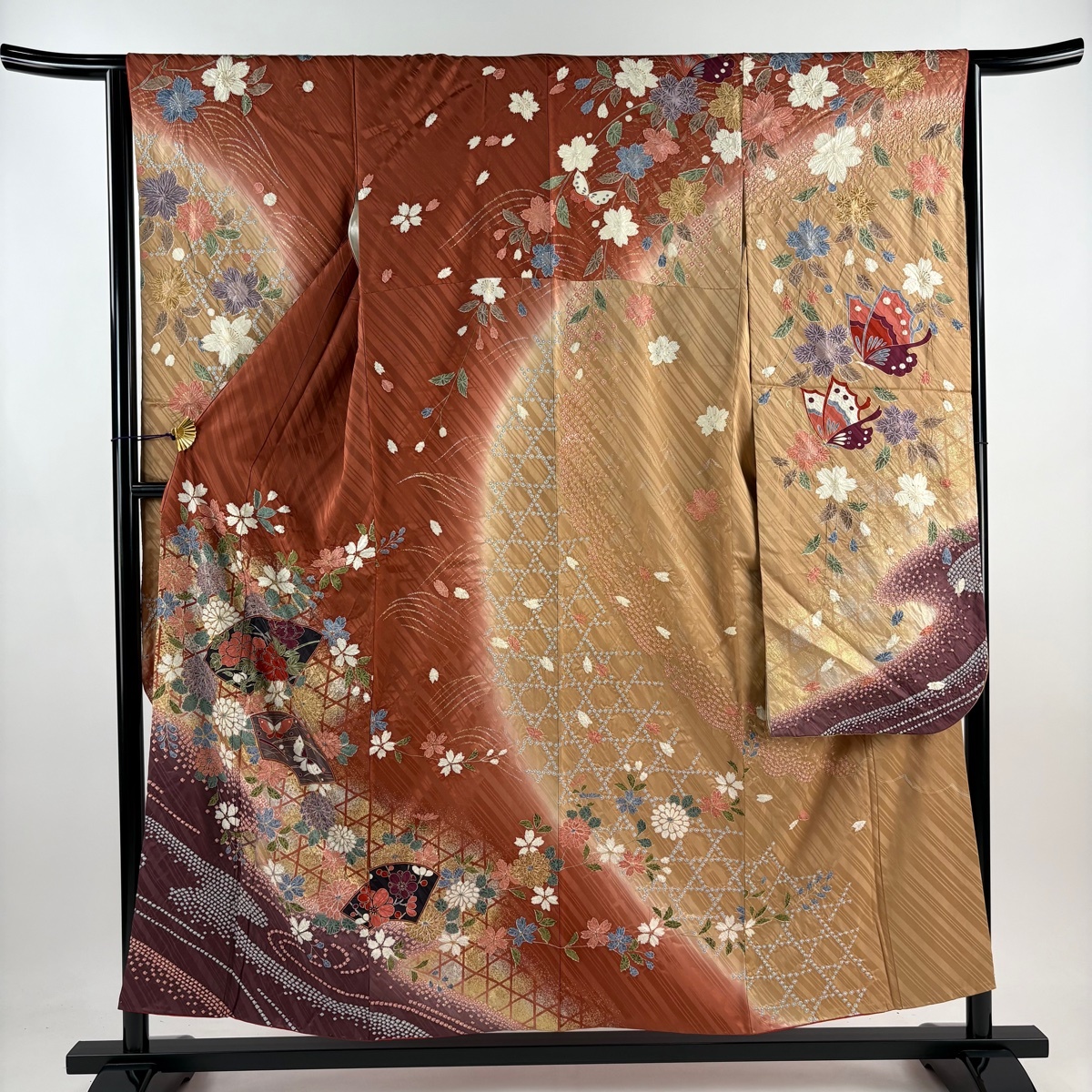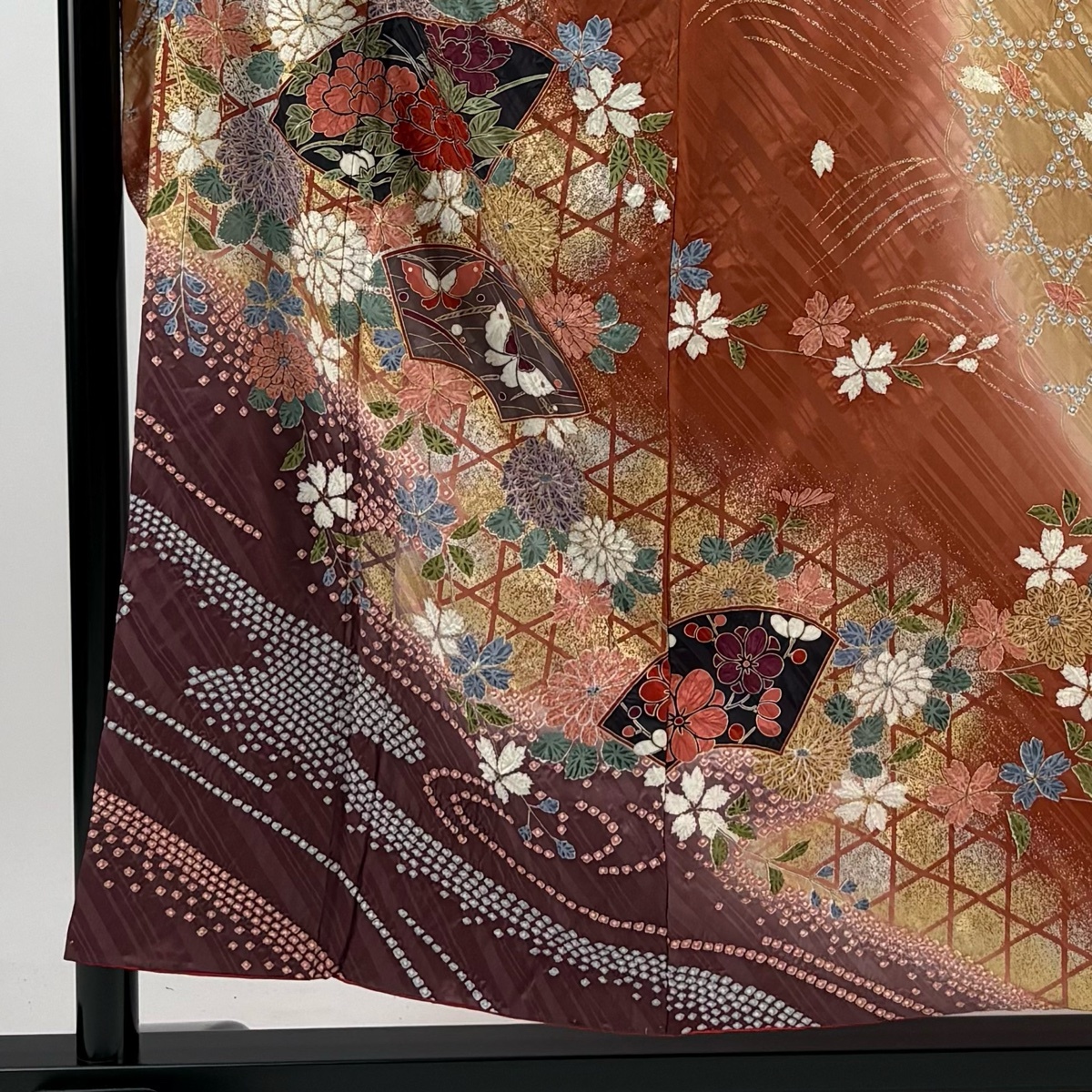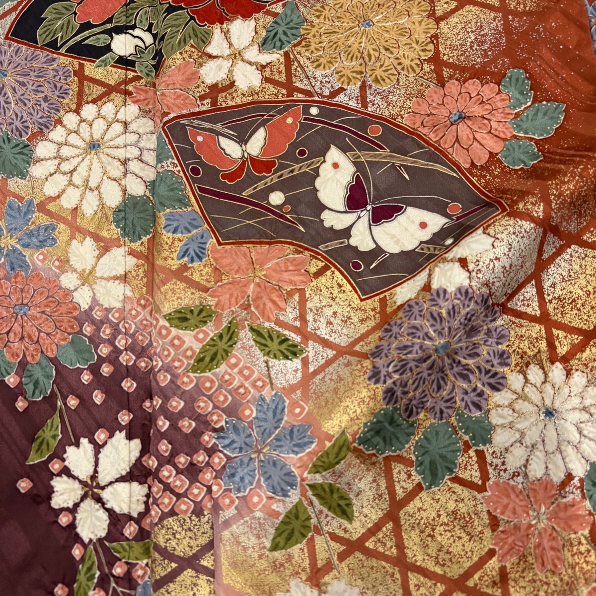 | 振袖 秀品 草花 扇面 金銀彩 染め分け 赤茶 袷 身丈154.5 裄丈64 M 正絹 【中古】 |