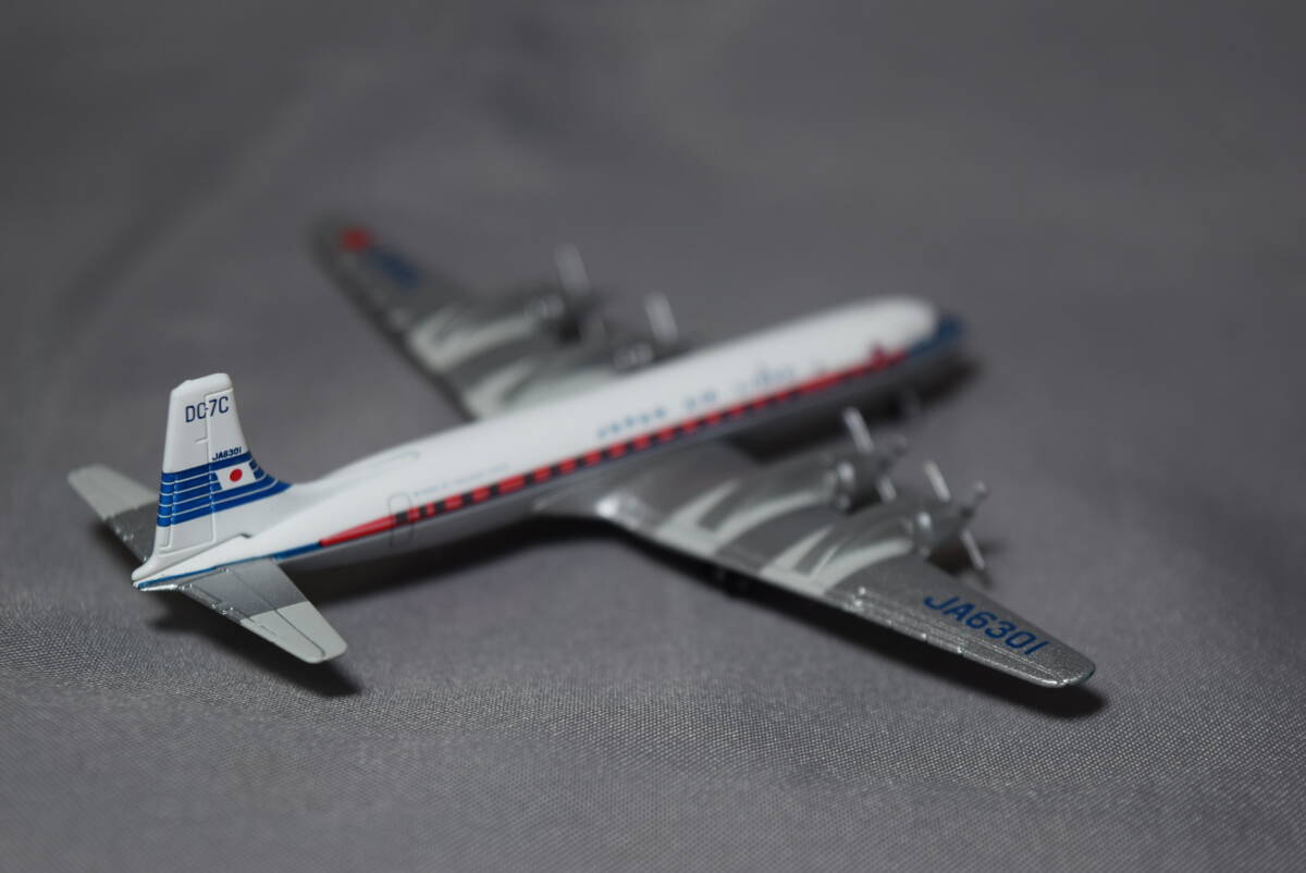 本機は、戦後の航空復興期に日航が導入したDC-3以来のレシプロ旅客機の最終形としてデビューするもジェット化の流れで短命に終わったDC-7Cです。