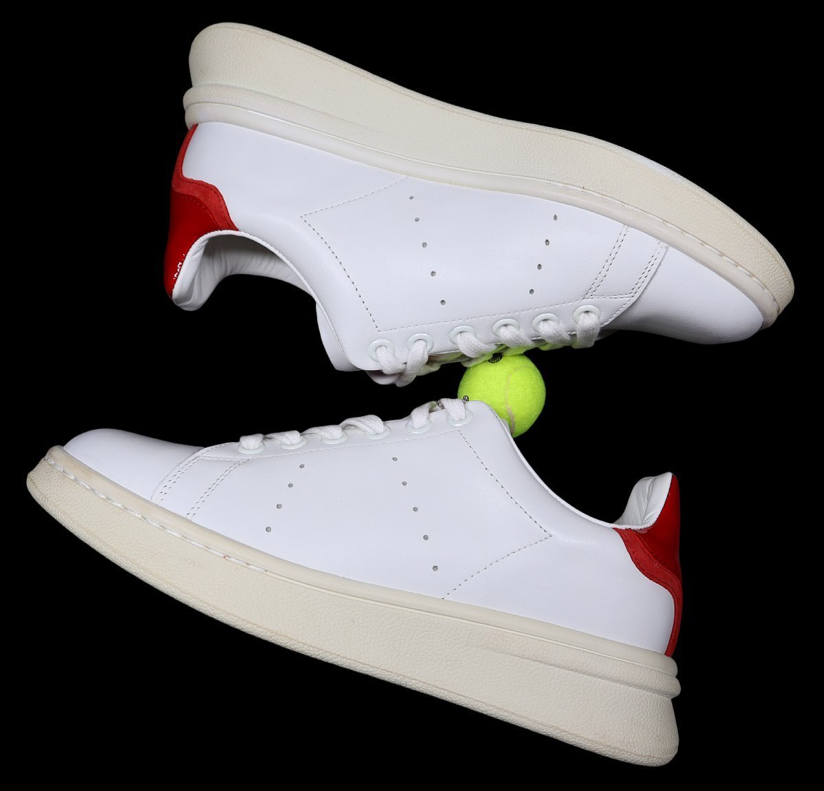 上質なプレミアムレザーのホワイト色に、ヒールには鮮やかなレッド色のエナメルレザー×スエードレザーになっており、洒脱なアクセントになっています!ベロやヒールには「THE TENNIS SHOE」モデルならではのロゴとアイコンがプリントされています。公式カラーは「WHITE」。