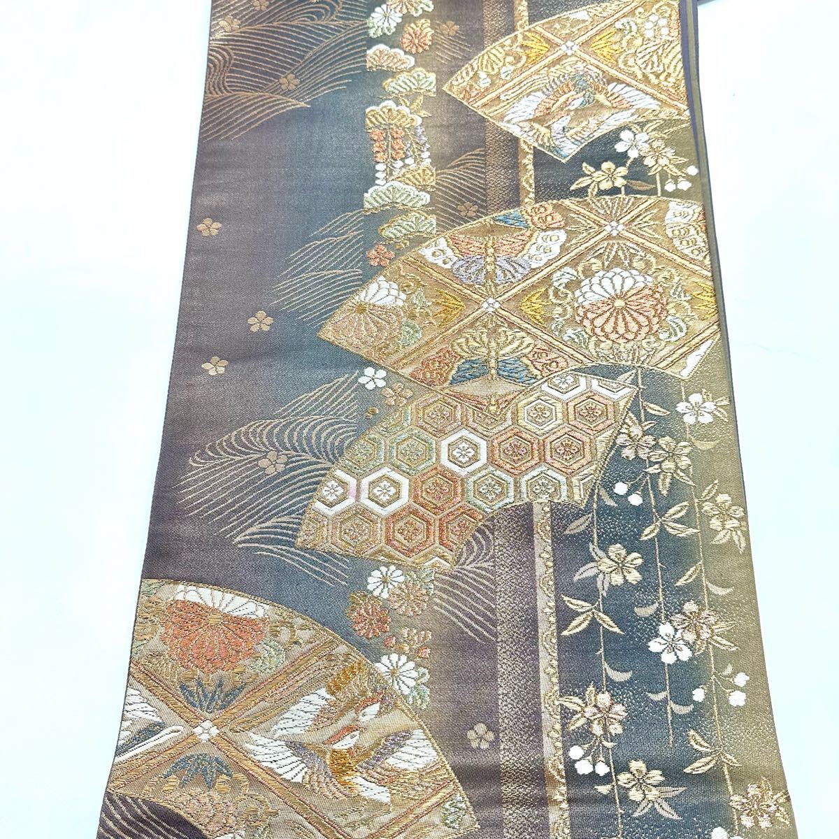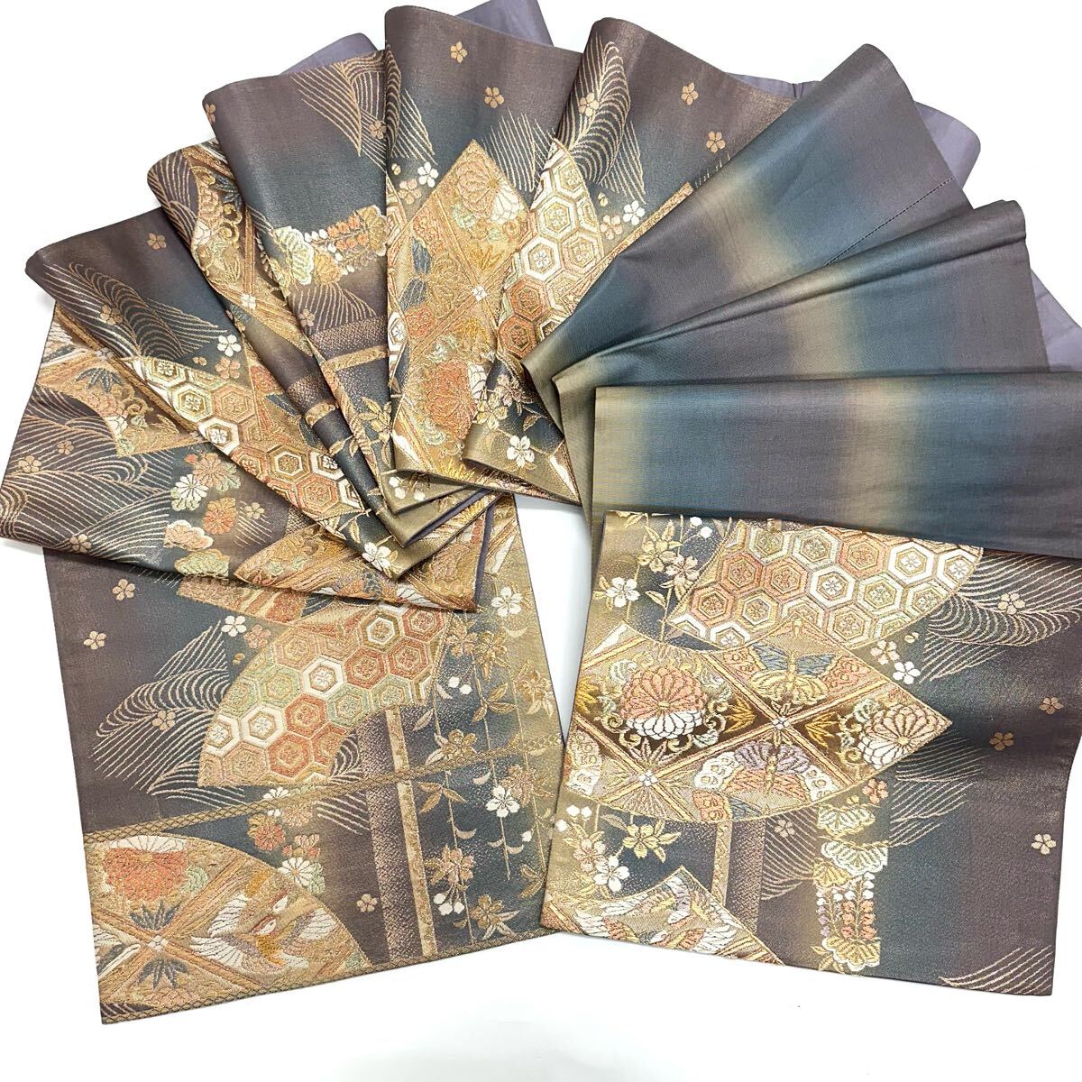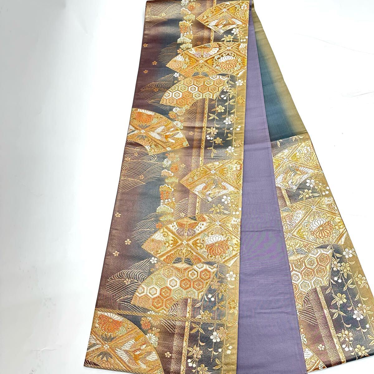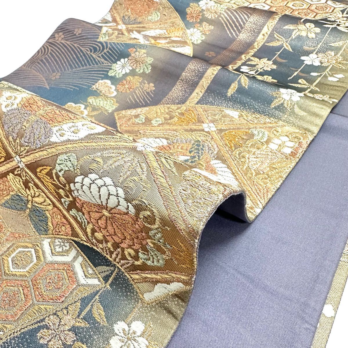 【七福】c665 逸品 高級品 正絹 袋帯 六通 扇面 花菱亀甲 鳳凰 金糸 刺繍 豪華
