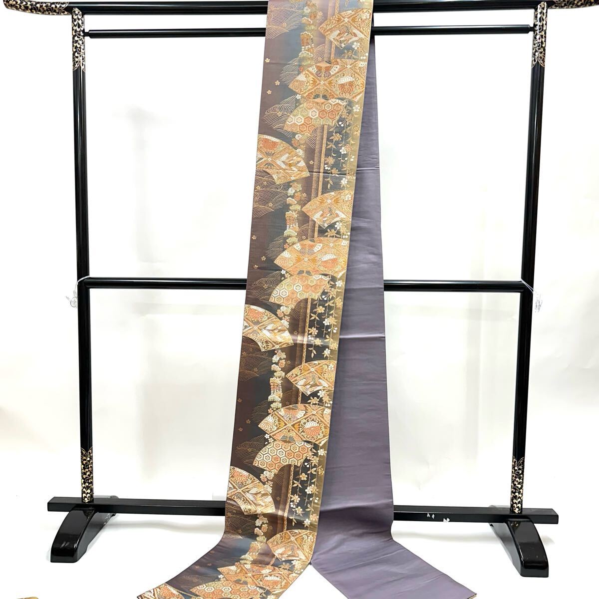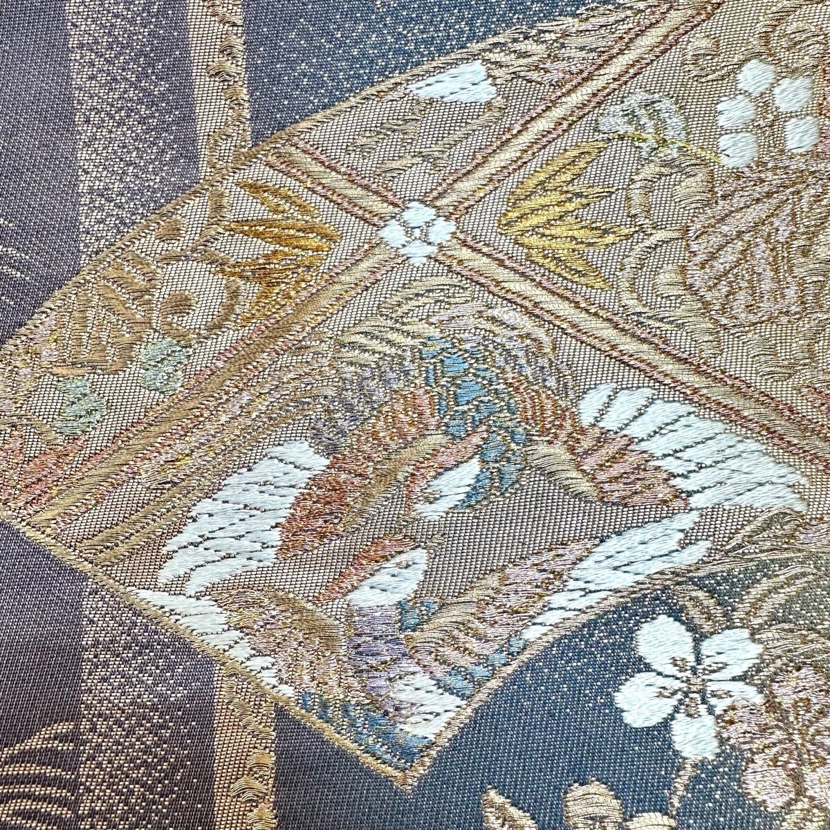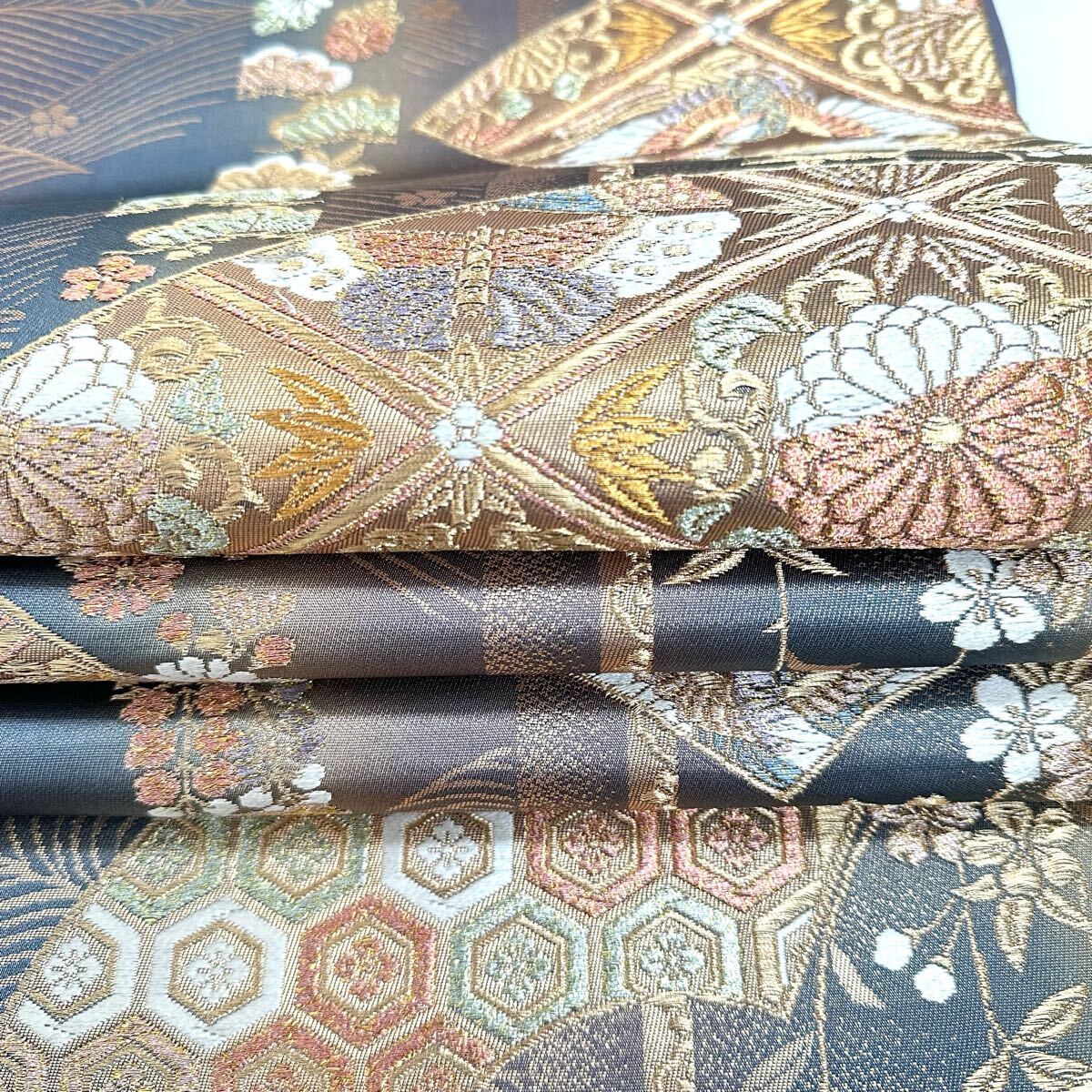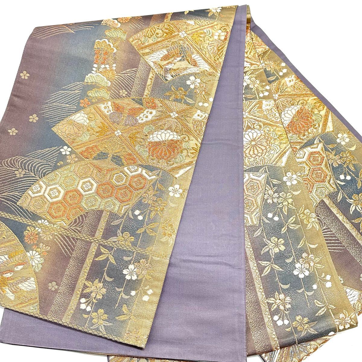 【七福】c665 逸品 高級品 正絹 袋帯 六通 扇面 花菱亀甲 鳳凰 金糸 刺繍 豪華