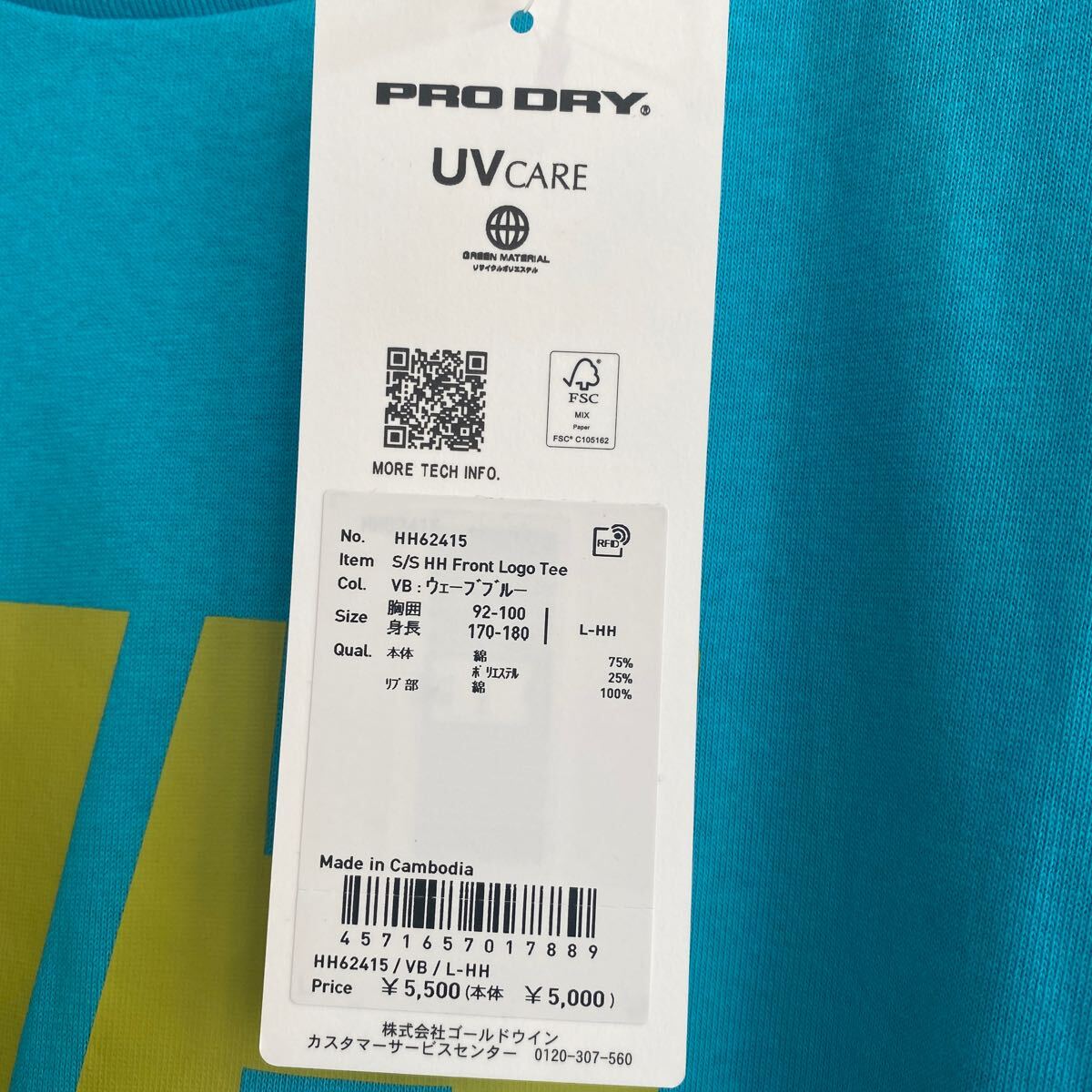 HH62415、ショートスリーブヘリーハンセン フロントロゴT、Lサイズ、ウェーブブルー、定価5500円、ゴールドウィン正規品 、着丈約6cm、身幅約53cm