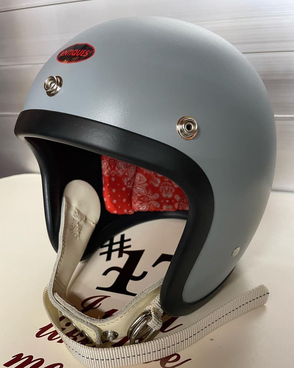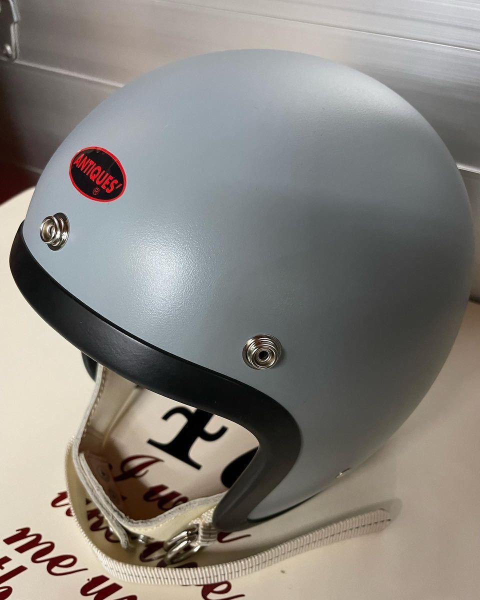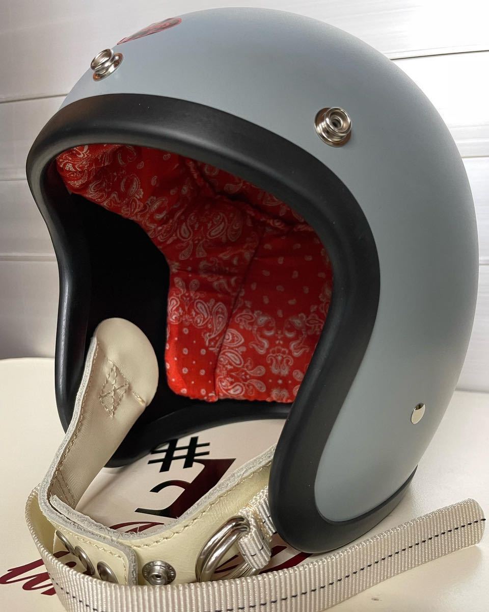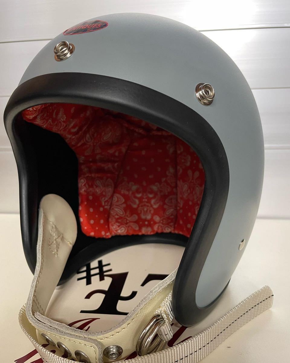 オールドヘルメットはダブルストラップの仕様が多く使われていて、金具、レザー部分がよりカッコ良さを引き立てます。