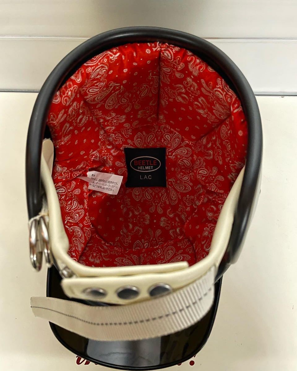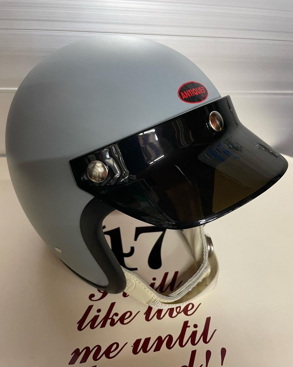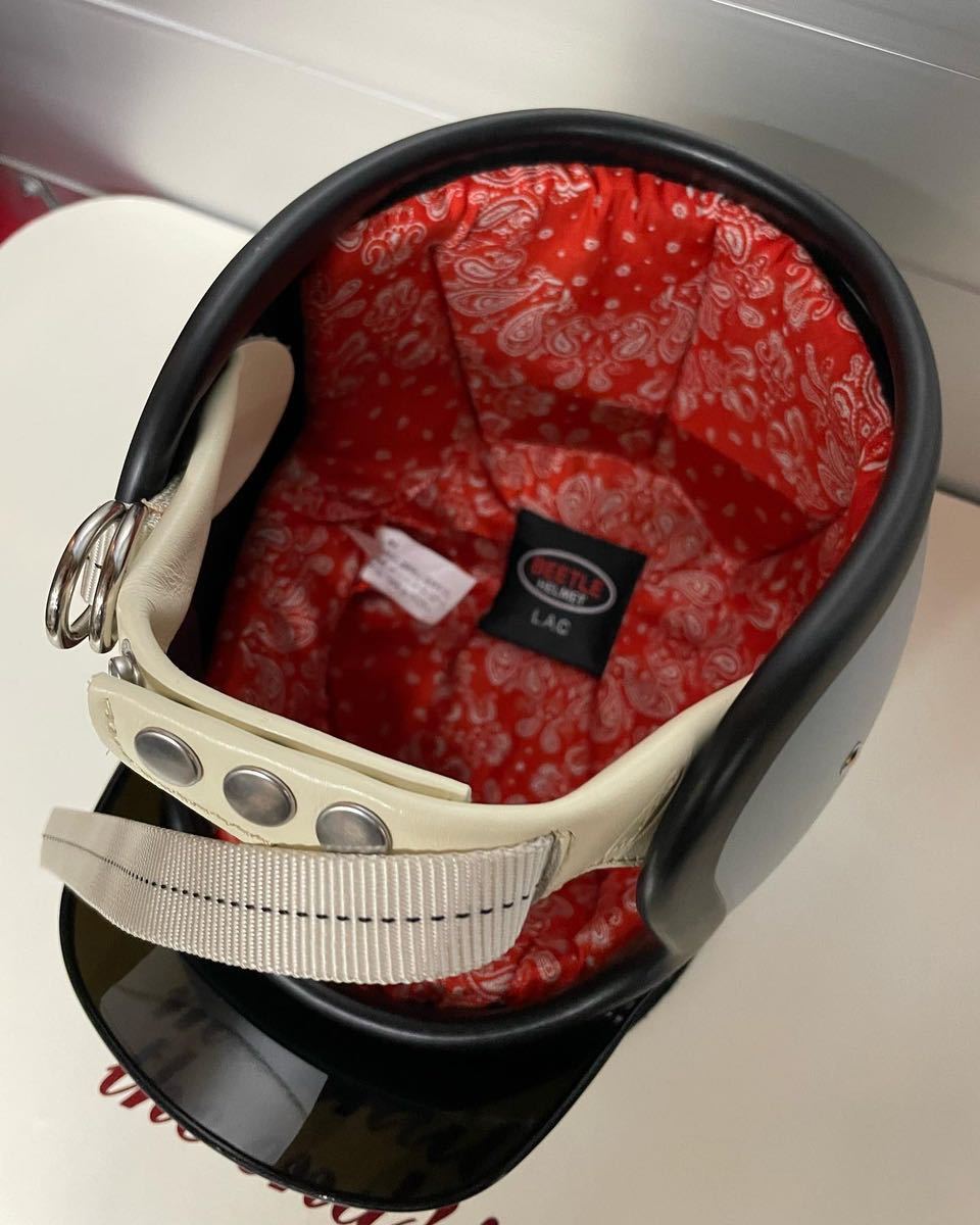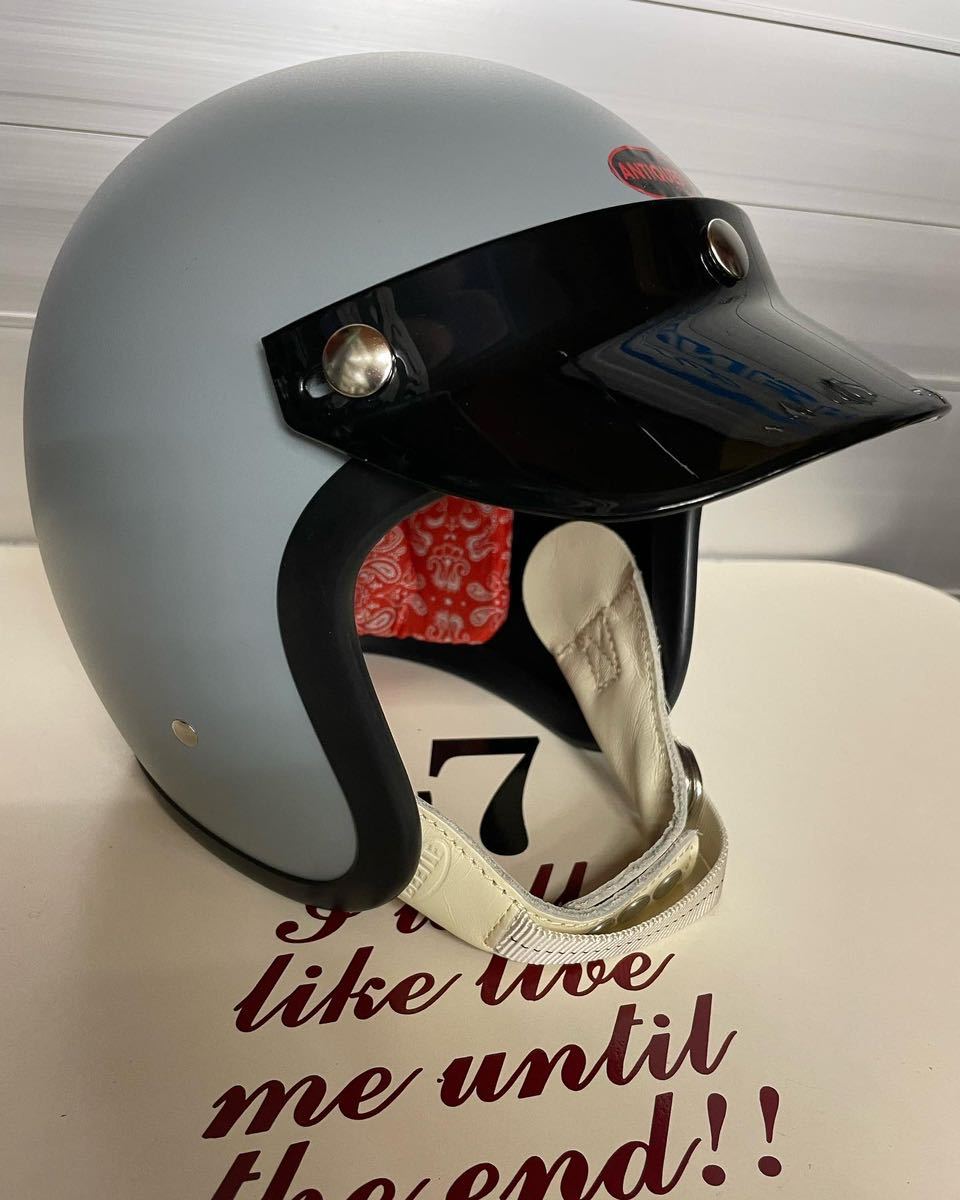 オールドヘルメットはダブルストラップの仕様が多く使われていて、金具、レザー部分がよりカッコ良さを引き立てます。