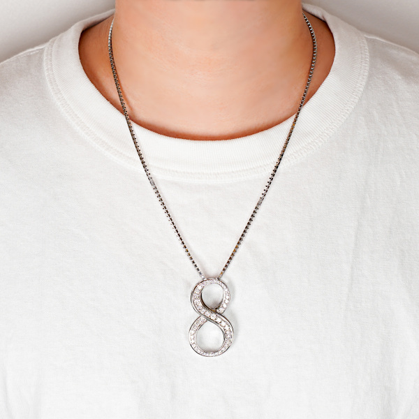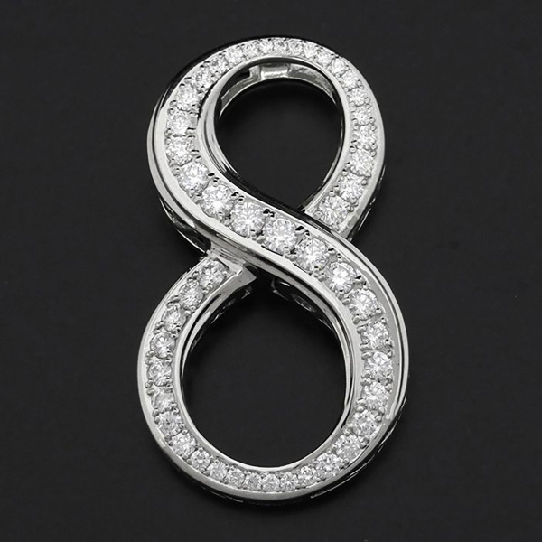 商品説明 | 数字の「8」をモチーフにした大きめペンヘッドです。普通の大きさでは物足りない、胸元に大きなアクセントが欲しい方にピッタリです。質の良い3カラット分のダイヤモンドを贅沢に使用しております。 |