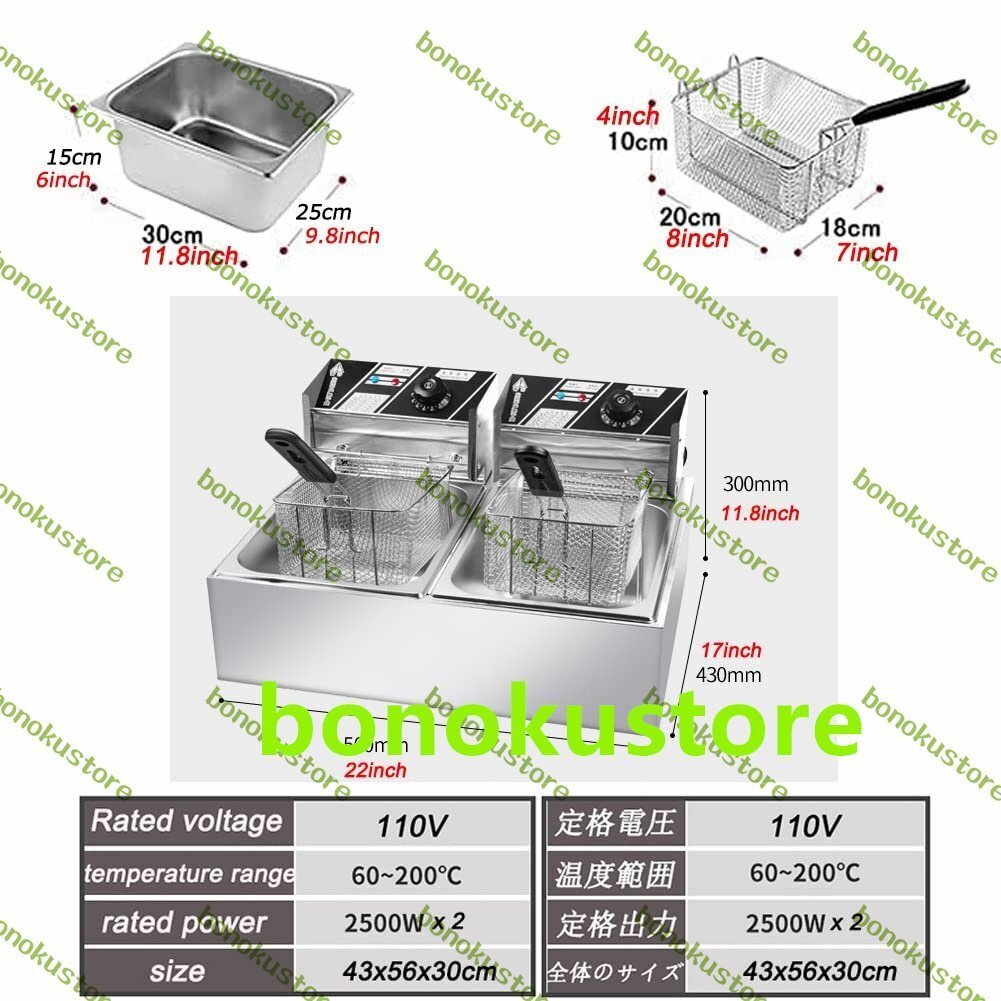 ★この2500W + 2500Wの二槽式電動フライヤーはステンレス構造を採用しています。レストラン、スーパーマーケット、ファーストフードレストラン、スナックバーなどの商業住宅向けに特別に設計されています。この大容量の6L + 6Lの天ぷら鍋を使って、毎回あなたの名物を完璧に揚げましょう。★デスクトップフライヤーは、素早く加熱できる5リング高エネルギー加熱を採用しています。揚げ物の各部の温度が60?200℃の範囲内であり、設定温度を超えると自動的に電源が切れ、温度が下がると自動的に温度が上がるという要件を満たしています。 仕様:商品名:電動フライヤー材質:ステンレス鋼電源:110V消費電力:2500W + 2500Wシリンダー容量:6L + 6L温度管理:60℃?200℃重量:7.5kgサイズ:560x430x300mmシリンダーサイズ:300x250x150mmフライングバスケットサイズ:180X200X100mm付属品:バスケット2個、蓋2個【幅広い用途】レストラン、スーパーマーケット、ファーストフードレストラン、スナックバー、家庭などの企業に適しており、あらゆる種類の料理、フライドポテト、鶏肉、魚、オニオンリングなどに適しています。●シンプルな操作パネル●クリーニングのために取り外し可能●フライバスケットは冷蔵庫から滑り落ちないように設計されており、安心して調理できます。●2スロットの軽量、コンパクト、省スペースの電動フライヤー。天ぷら、コロッケ、フライドチキンが美味しいです。暖かい:★お子様の手の届かないところに保管してください。製品をソケットに接続するときは、放置しないでください。★撮影時の光やパソコンの環境により、実際の商品と多少色や質感が異なる場合があります。★お届けまでに通常7?12日かかりますが、ご不明な点がございましたらお気軽にお問い合わせください。