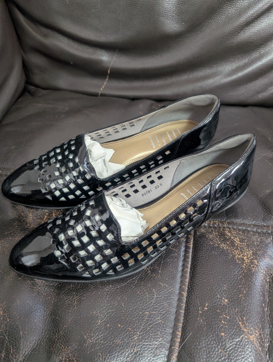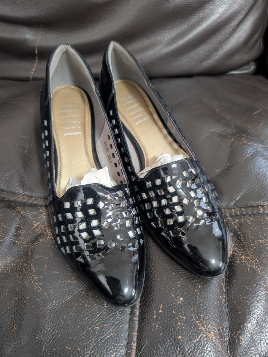 美品!フィットフィット☆天然革製、エナメル調、デザインパンプス、サイズ23.5.黒になります。