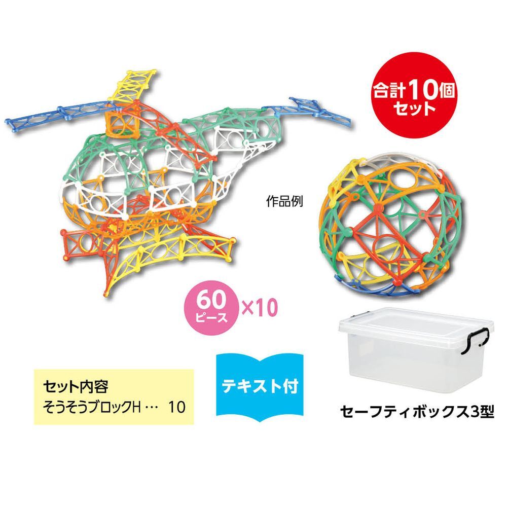曲げたり反らせたり自由自在に組み立てられる「そうぞうブロックスペシャルセット」です。特別支援や幼児教育の現場で活躍する自立活動用教材セットです。柔らかいプラスチック製のブロックは平面から立体までさまざまな作品が作れ、子どもの発想力・創造力を自然に育てます。組み立て時には、はめる・曲げる・ひねるといった手先の動きを促し、手先の感覚や空間認識能力も養えます。付属のテキストには活動の目的やアプローチ方法が詳しく記載されているので、指導が初めての方でも安心して取り組めます。さらに、収納に便利なプラボックス付きで使わない時もスッキリ片付けられます。1セット60ピースのブロックが10セット入っています。