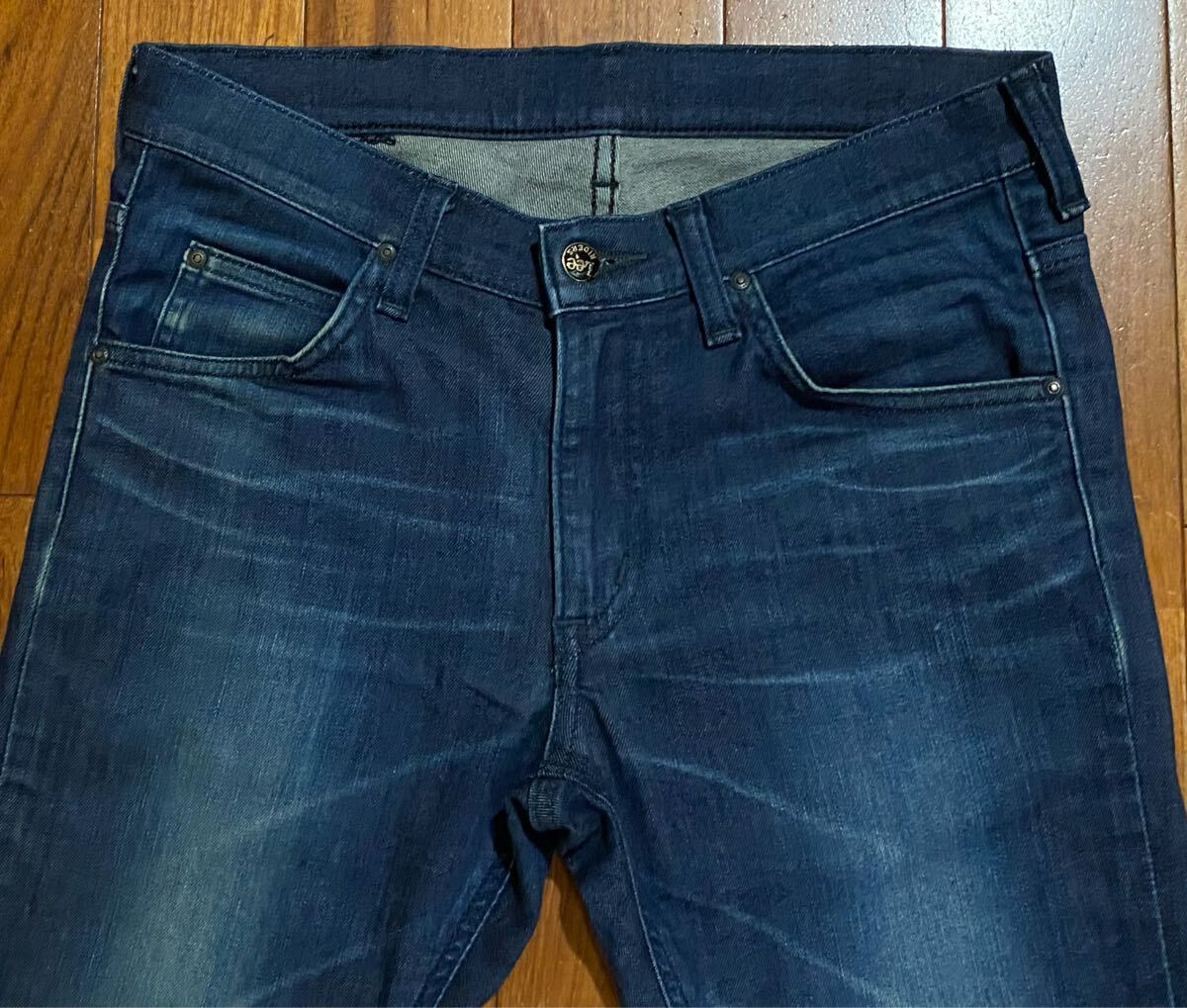 リーライダースのジョガーズ スキニーデニム(ジーンズ)、LM0307です。色はインディゴブルーです。USEDですが状態は良いです(10段階中8程度)。生地はストレッチ入りで綿95%、ポリエステル4%、ポリウレタン1%です。牛革パッチ、ジッパーフライ、裾はチェーンステッチです。正規品です((株)エドウィン、日本製)。サイズはSでウエストは重ねずに平置きで約78cm、ヒップ約94cm、股上約23cm、股下約81cm、股下15cmのふともも部分約45cm、裾まわり約30cm、重量約480gです。発送はゆうパケットポストになります。