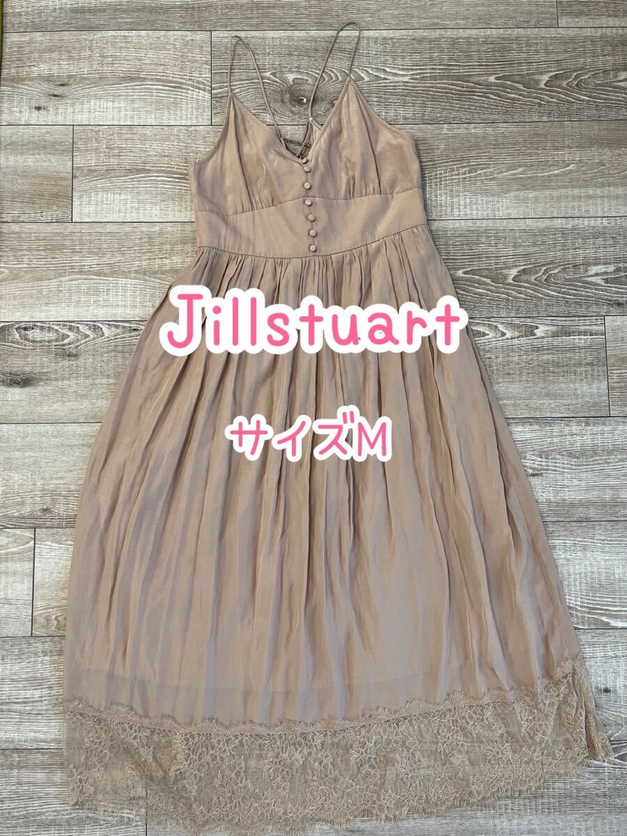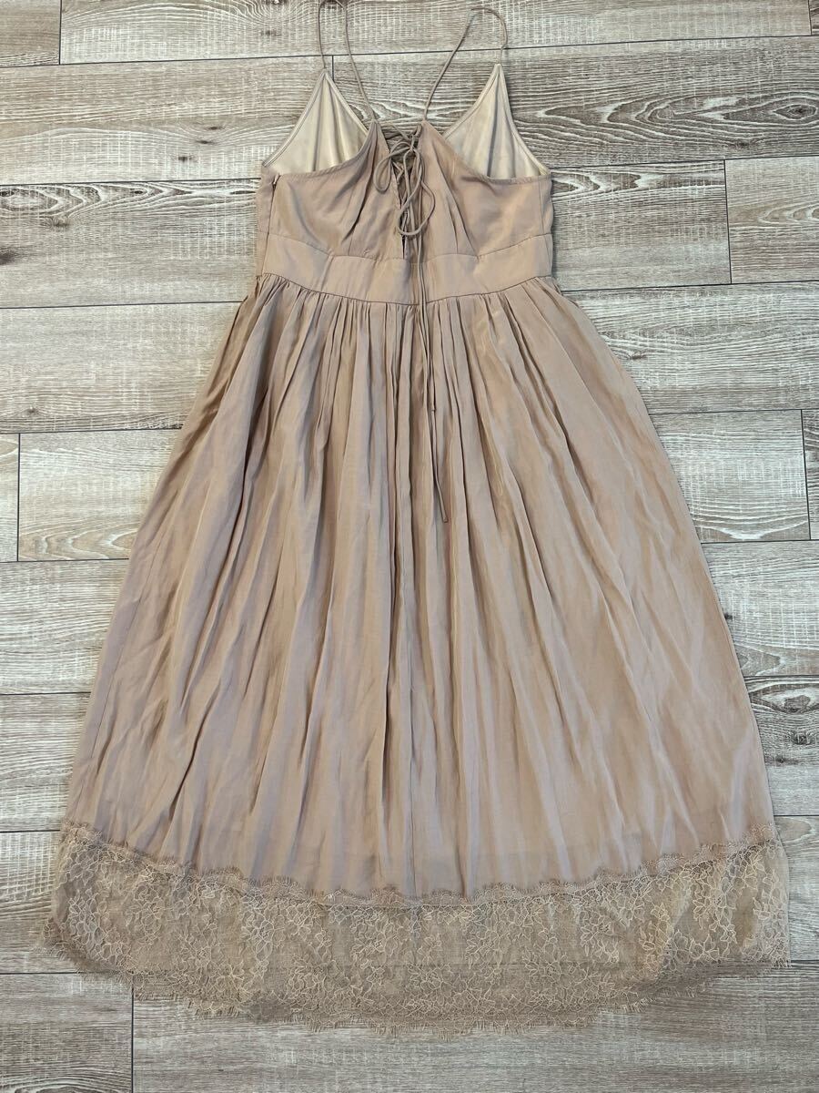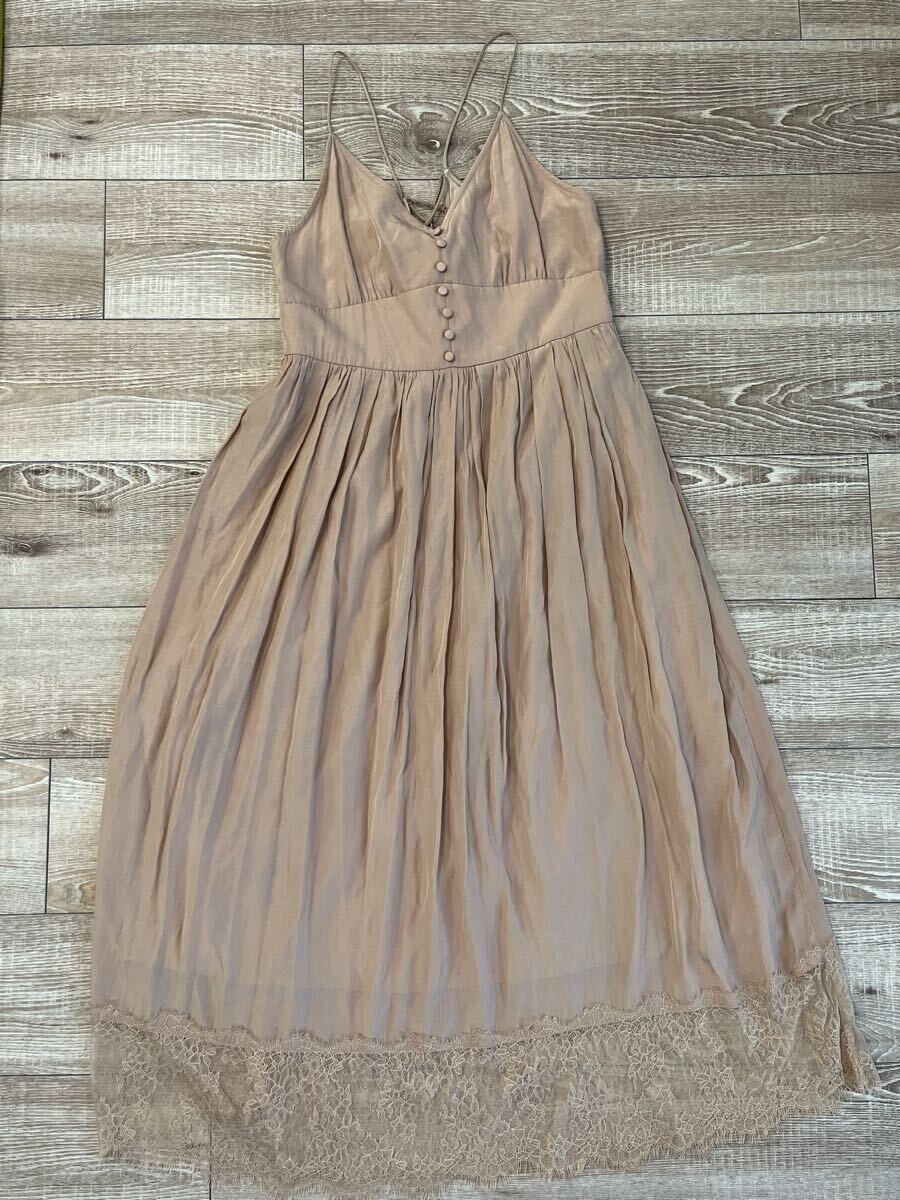 キャミソールデザインのピンクベージュロングワンピース、レースの裾付き。