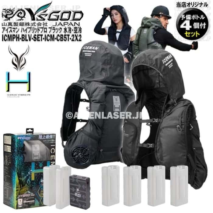 「アイスマンハイブリッドプロ」水冷空冷ベスト。サイズ目安。FREEサイズM-5L相当。重量約2.7kg。付属品。ファン×2 バッテリー×1 ボトル5.0×1 ボトル3.0×1ケーブル×1 専用充電器×1 (1)PSマークの種類:PSE(2)事業者名:山真製鋸株式会社(3)製品本体に貼付されている登録検査機関名称:関東経済産業局「アイスマンチャージボトル 5.0 3本入り」容量約1000ml。※モニターの発色具合により、実際のものと色が異なる場合がございます。