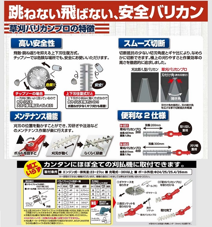ニシガキ製の刈払機用アタッチメント 安全往復バリカン 草刈バリカンプロ400の N-852 です。