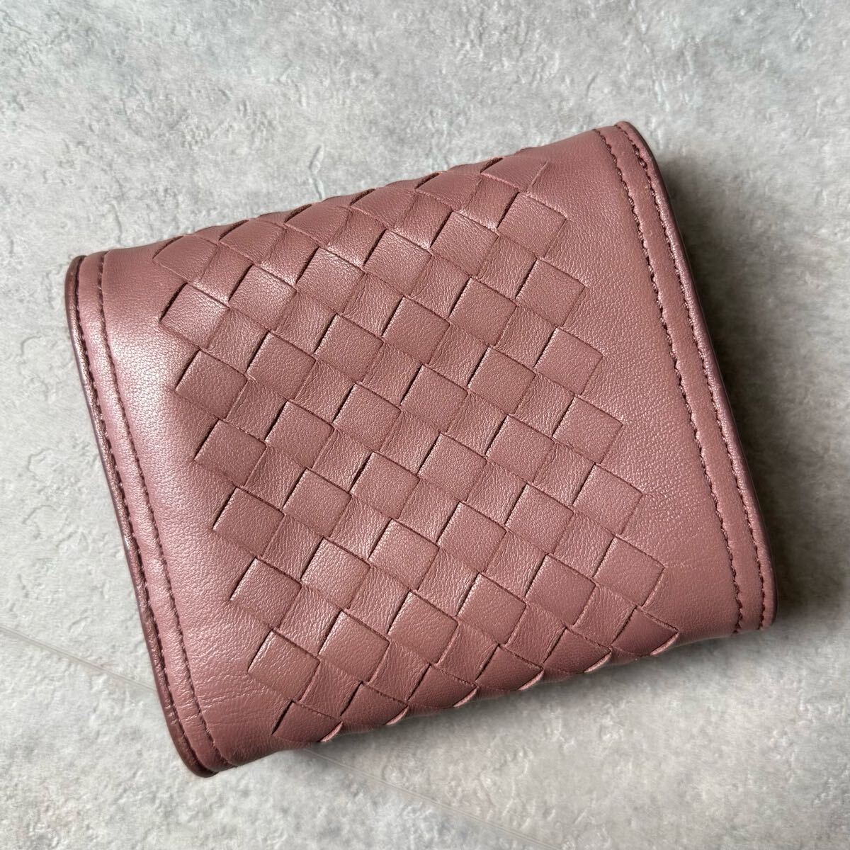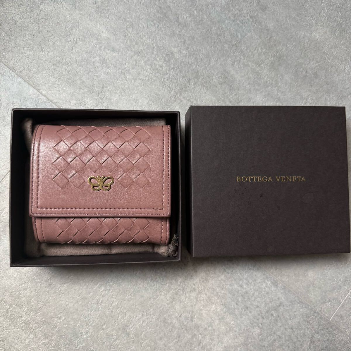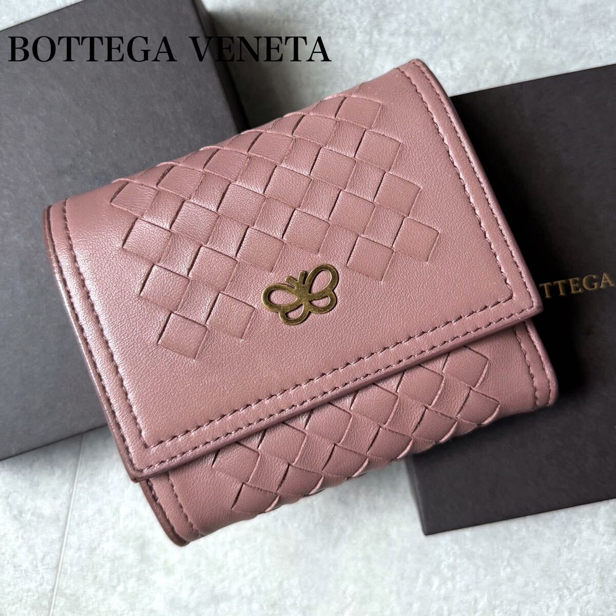 美品 希少 BOTTEGA VENETA ボッテガヴェネタ イントレチャート モーヴピンク レザー 三つ折り財布 コンパクトウォレット バタフライ 蝶