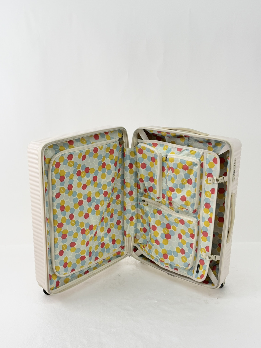 スーツケースメーカーであるエースの女性社員チームが、「本当に欲しいと思うスーツケースを作る」というコンセプトのもと開発した≪ハント マイン≫。ターンテーブルで見つけやすいシンプルかつ個性的なデザイン。表面はキズが目立ちにくいマットな質感で、斜めのリブをつけて耐久性を向上させています。キャスターには電車での移動時などに勝手に動いてしまわないようストッパー付き。内装は小物がたっぷり入るマチ付きポケットと、空港やホテルで開けても衣類が見えない収納スペース。本体カラーごとに異なるデザインのプリント生地を使用し、開けるたび楽しい気分に。デザインや機能のひとつひとつに、旅が快適になるアイデアが詰まっています。