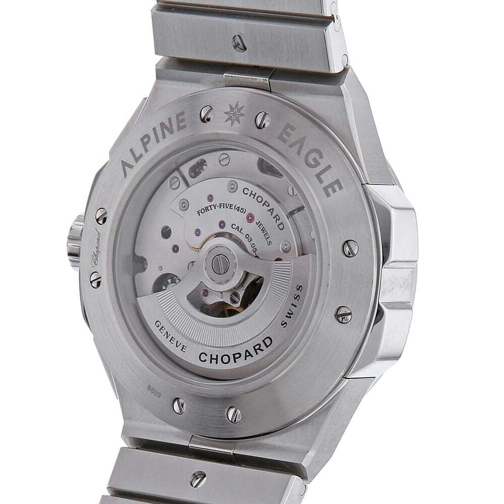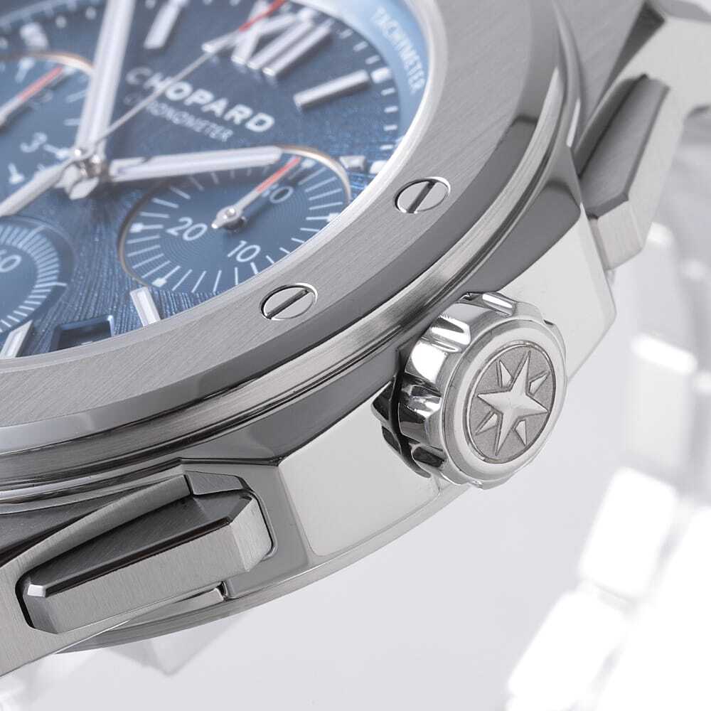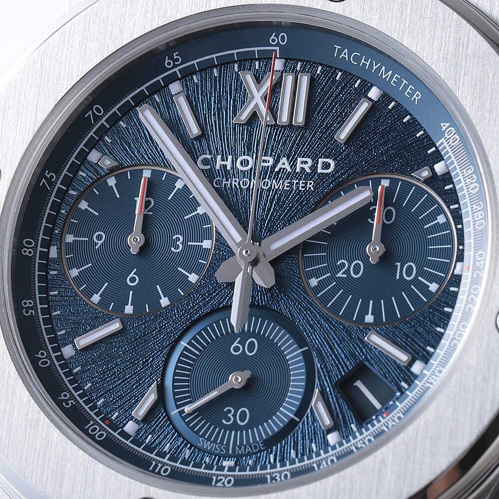 モデル情報 | ショパールの共同社長を務める「カール・フリードリッヒ・ショイフレ」が1980年に生み出した最初の時計サンモリッツ。それを現代的に解釈したモデルがアルパイン イーグルです。ブルーの文字盤は、鷲の目の虹彩を彷彿とさせる特殊な模様がデザインされています。また、クロノグラフ針は鷲の羽を思わせる矢の形をしており、アルプスの鷲とそのビオトープへの情熱、自然との調和を感じさせます。44mmケースにフライバック機能を備えたクロノメーター認定クロノグラフムーブメントを搭載。100m防水。 |