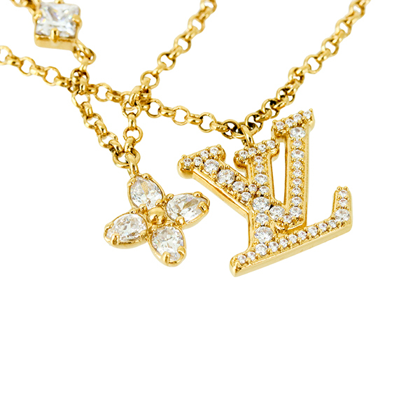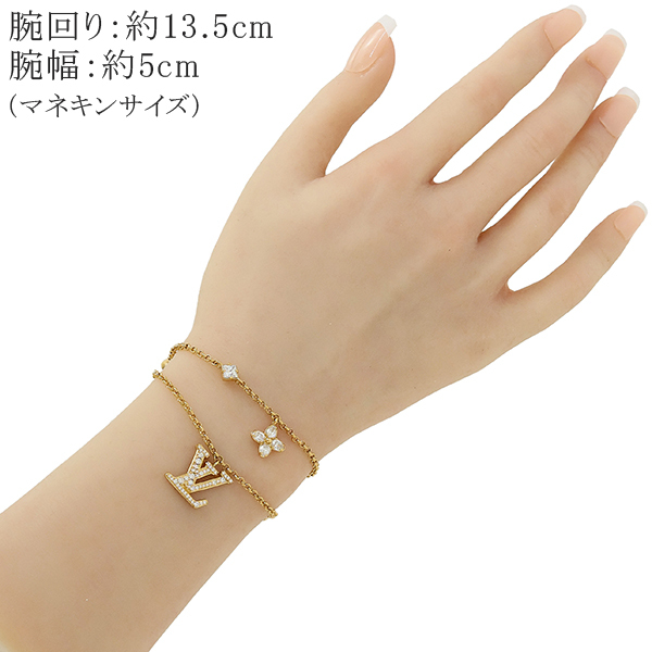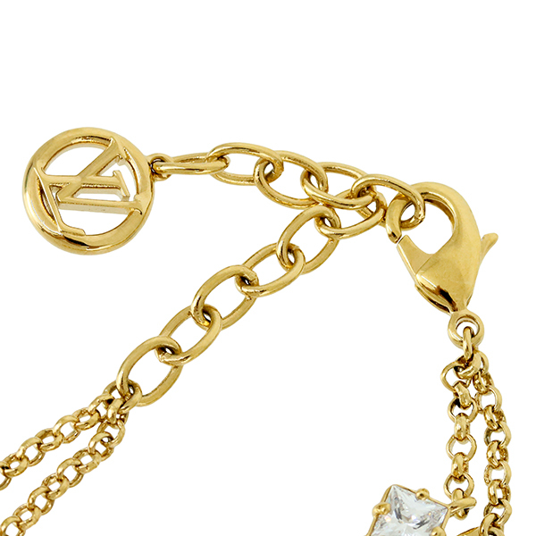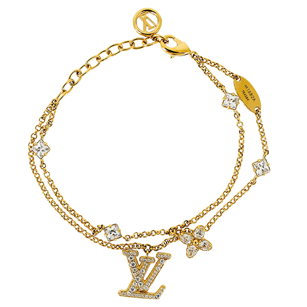 スタッフコメント | ルイ・ヴィトンのアイコンと言えるフェミニンな「ブレスレット・レディ LV」。ゴールドカラーのメタルチェーンを2本重ねたデザインに、きらめくストラスを散りばめたLV イニシャルとモノグラム・フラワーのチャームをあしらいました。さらに3つのストラスとLV サークルのチャームが、エレガントなブレスレットのラグジュアリーで特徴的なスタイルを引き立てます。 |