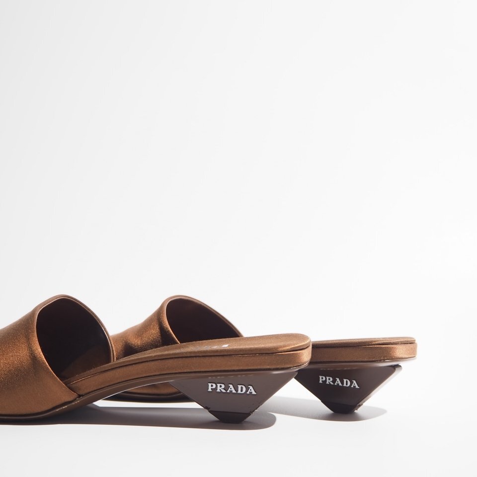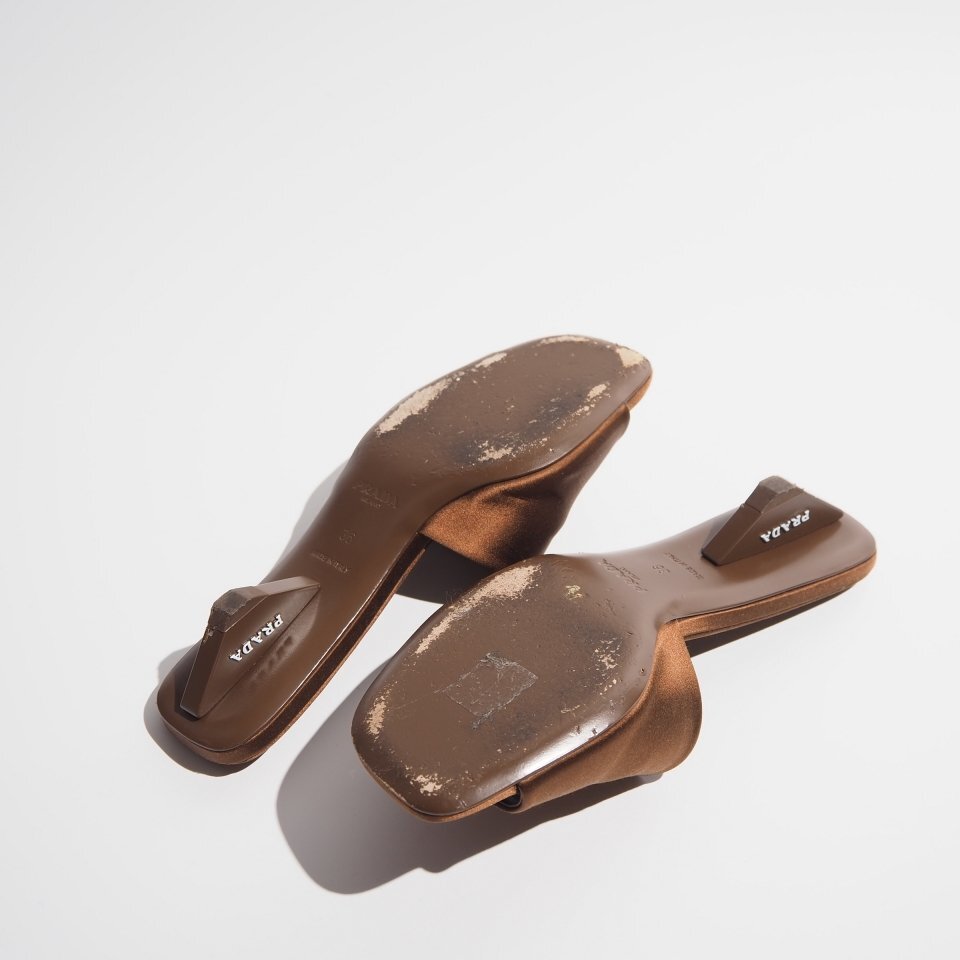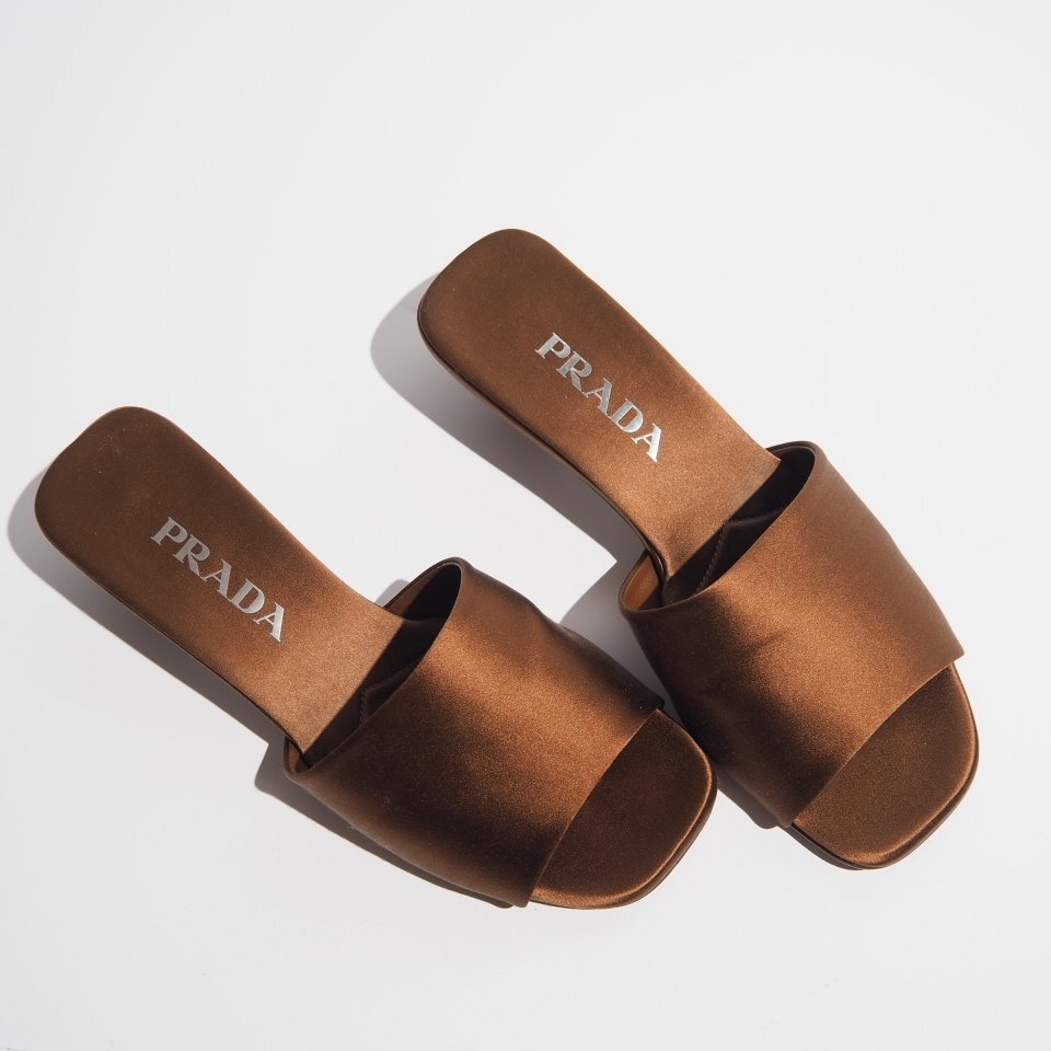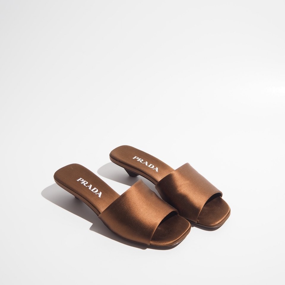 R1788P ▼PRADA プラダ▼ 24SS ロゴヒール サテン サンダル ブラウン 36/23cm シューズ ミュール 春夏 rb mks