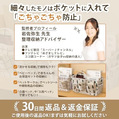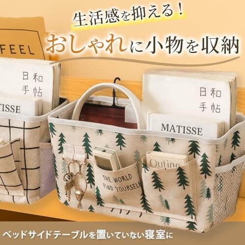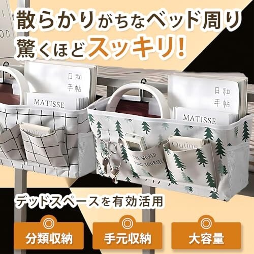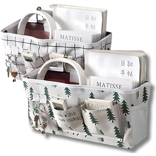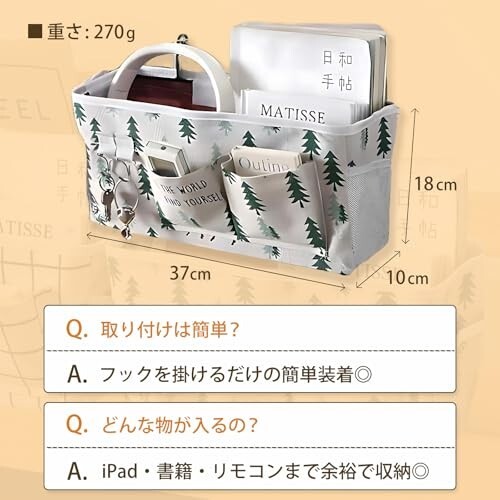 57×37cmの大容量ハンギング収納。コットンリネン混紡のナチュラル質感に、チェック柄&ツリー(森林・鹿)柄の癒しデザイン。二層構造と底部固定板で型崩れしにくく、iPadやA4書類、文庫本までしっかり収納できる2個セットです。