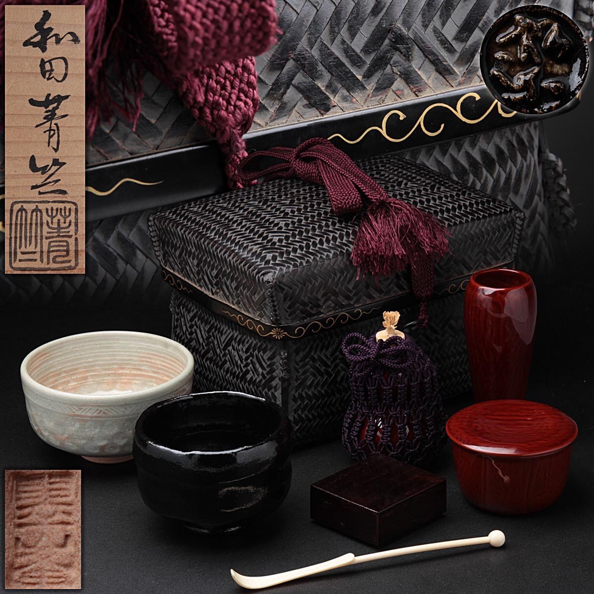 | ◆ 【和田菁竺 作】御所籠 色紙点前 一揃 共箱附 牙茶杓 在銘茶碗 等・御所篭・茶籠 茶道具 ◆