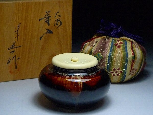 60TR81★茶道具 桶谷定一作 大海茶入 共箱付 仕覆付 陶器 濃茶器 煎茶道具 容器 伝統工芸