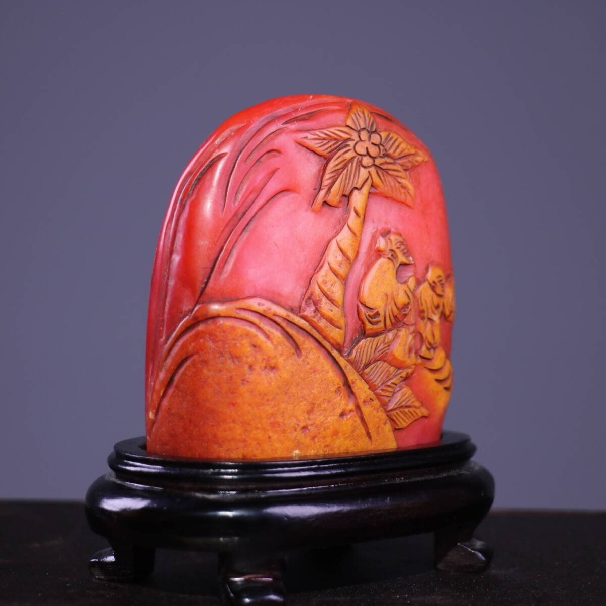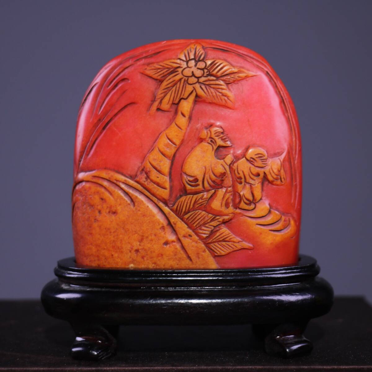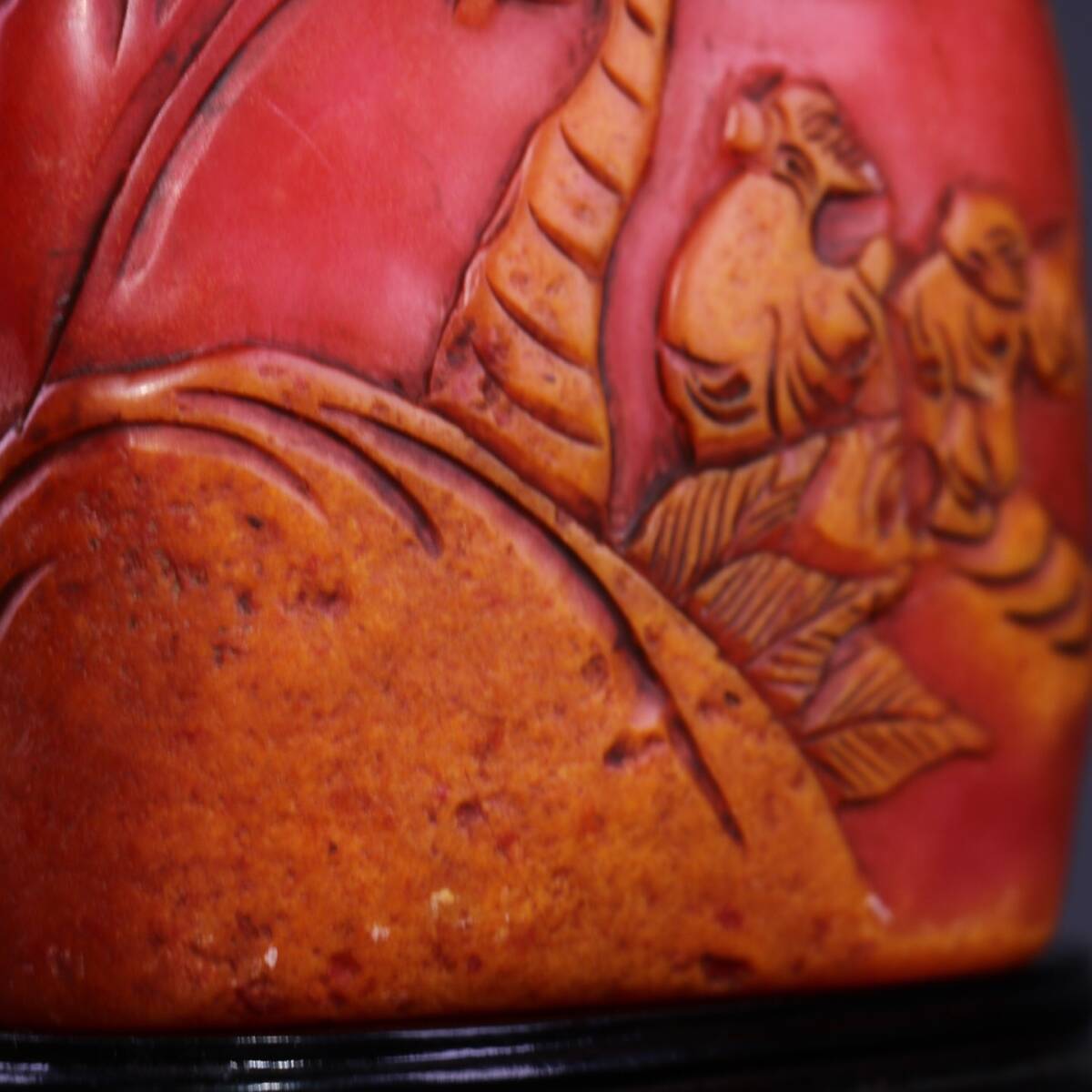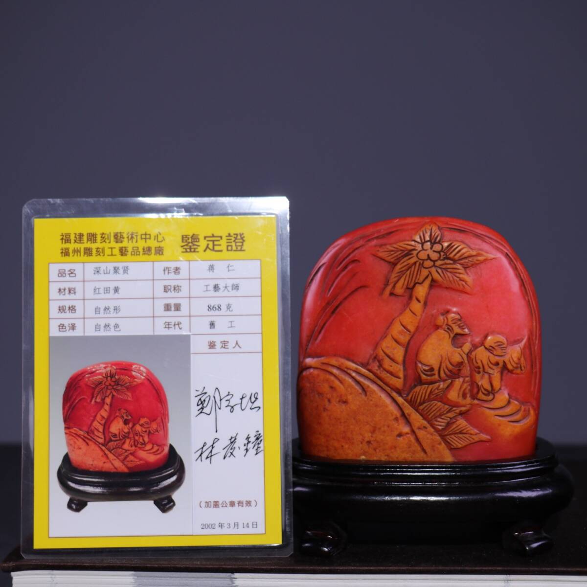 【超珍館蔵】寿山石 紅田黄石 細密彫 深山聚賢紋印章 印章 印鑒 文房具 書道品 古賞物 古董品 古美術品 時代物 旧家蔵出 稀少珍蔵品